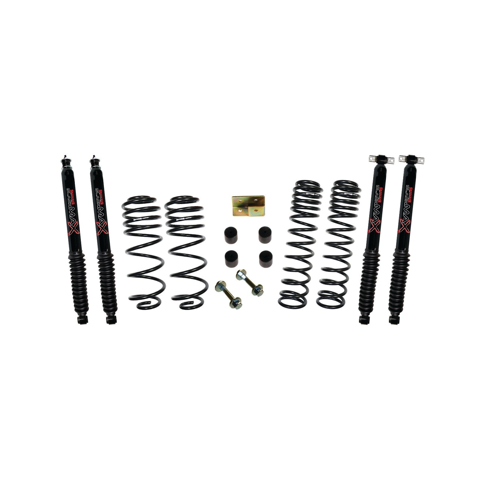 All in one box Shocks included 2.5 inch Long Travel Suspension Lift for 1997-2006 Wrangler and Wrangler Unlimited with Front and Rear Long Travel Coil Springs, Track Bar Relocation Bracket, Bump Stop Extensions, Alignment Cam Bolts, Front and Rear Black Max Series Shocks.