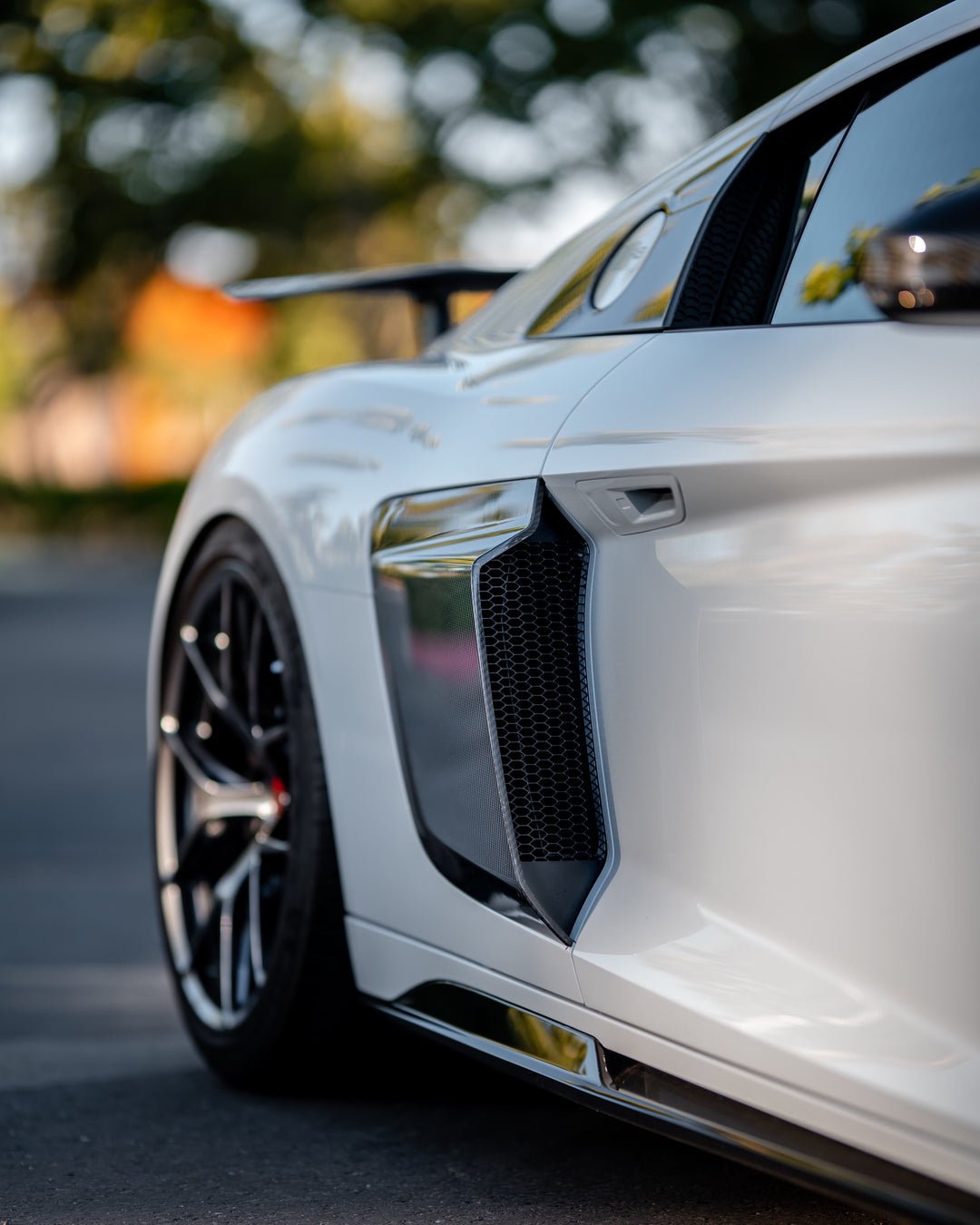 Make your Audi R8 unique with our Audi Sport LMS GT4 100% carbon fiber side blades. These blades are 40% wider than the standard OEM side blades with a much more aggressive and angular design.