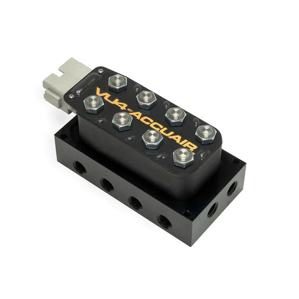 AccuAir knows the importance of a high quality valve manifold and that is why we have developed the VU4 valve manifolds for your air suspension systems. This VU4 valve manifold is a 4 corner manifold, meaning that it is designed to inflate and deflate 4 individual air springs. The VU4 manifold is outfitted with ¼” NPT fittings on all ports for easy installation of your air suspension system plumbing.