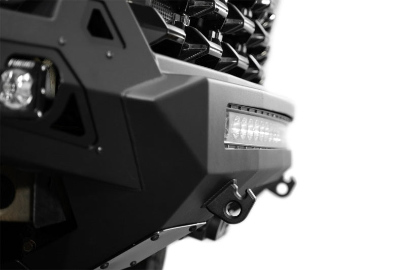 Our Stealth Fighter Front Bumper brings an aggressive style that complements the factory style, and brings additional utility to your truck. The bumper follows the factory body lines with the tightest of tolerances. At the center of the bumper is a light mount that can take a 40-inch radius light bar, or 10 individual 3-inch cube lights. Each wing of the bumper can also mount a 3-inch light pod for even more lighting. An optional extreme duty hidden winch mount is also available. Additional recovery options are provided by 1-inch thick clevis mounts that take ¾-inch D-rings. The satin black skid plate provides protection beneath the front end, and is easily removable if desired. The Stealth Fighter is compatible with adaptive cruise control & retains full functionality of the parking sensors. Finished in a durable hammer black powder coat, this bumper is fully bolt-on and made in the USA from American steel.