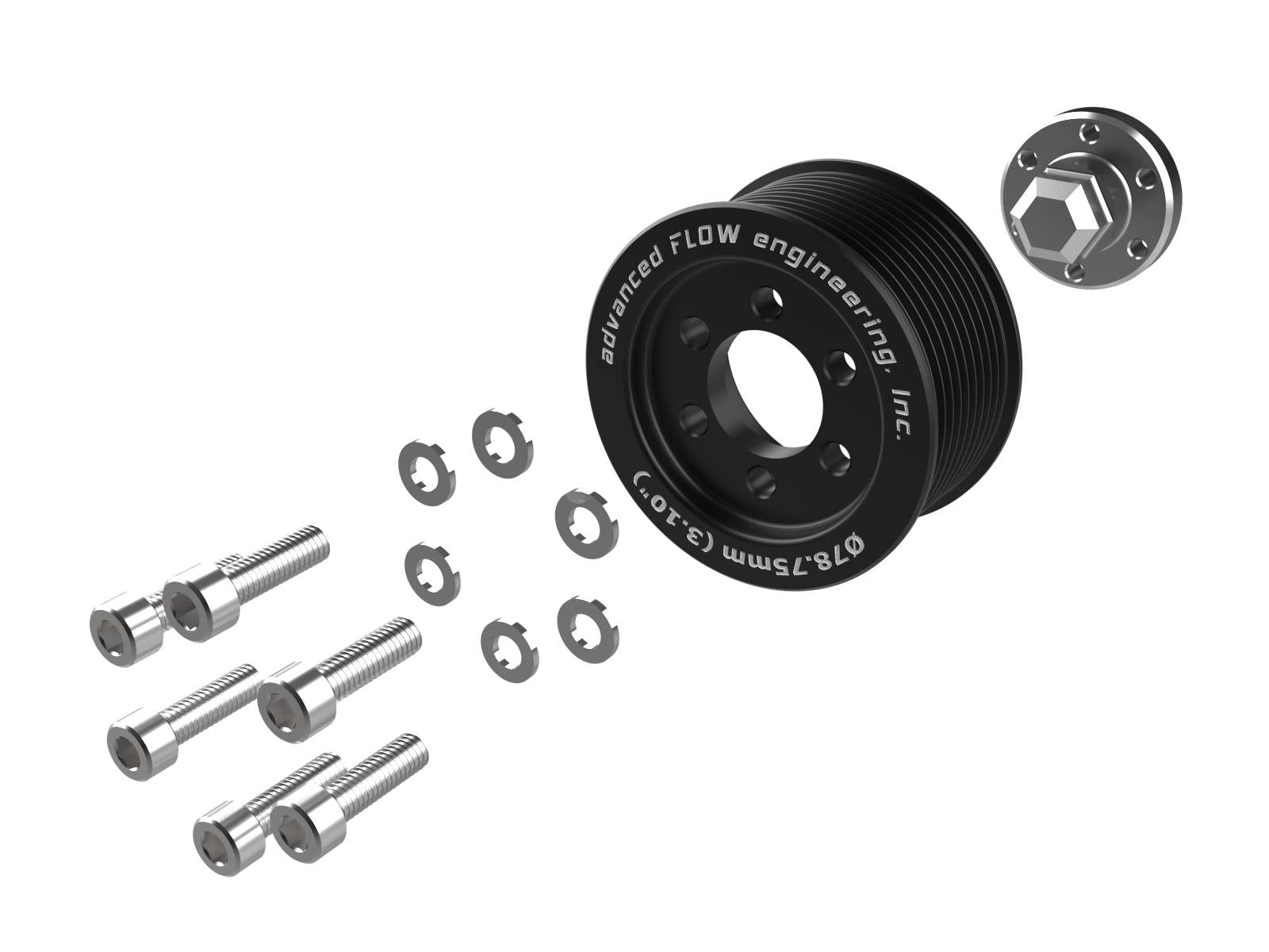aFe POWER Supercharger Power Pulley Kit w/ Hub 3.10 IN aFe POWER Supercharger Power Pulley Kit w/ Hub 3.10 IN Dodge Charger/Challenger Hellcat 15-23 V8-6.2L (sc) Enhance your engine's performance with our bolt-on aFe POWER Pulley kit. By changing the pulley diameter, you can adjust the spin rate of the supercharger, resulting in increased boost and amplified power. The aFe POWER Pulley kits are meticulously crafted to achieve a perfect equilibrium of lightweight design and high strength through precision machining. Count on our pulley kits for optimal functionality, a flawless fit, and an impeccable finish, ensuring a seamless boost to your engine's power. Pulleys crafted from high-quality 6061-T6 billet aluminum showcase exceptional characteristics. Through precision machining, these pulleys achieve a remarkable balance of light weight and high strength, ensuring not only optimal functionality but also a perfect fit and finish. Our pulley kits featuring a 17-4 stainless steel hub, combining corrosion resistance and high strength through precision machining, ensuring a perfect fit, impeccable finish, and optimal functionality. Please note that special tools are required for removing the factory pulley from the supercharger snout, and we recommend professional installation for the kit to ensure seamless performance. Pulley Size: Ø78.75mm (3.10") Boost increase by approximately 1.5PSI ±.5 CNC Machined 6061-T6 Aluminum Pulley Black Hard Anodized Finish Laser Etched Logo and Sizing CNC Machined 17-4 Stainless Steel Hub Includes Screws, Washers & Thread locker Tuning is Recommended Smaller Belt Not Required