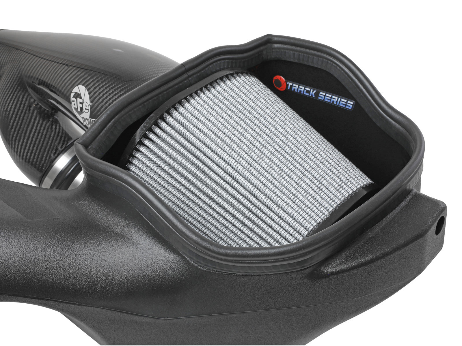 Track Series Carbon Fiber Intake System w/ Pro DRY S Filter Track Series Carbon Fiber Intake System w/ Pro DRY S Filter Ford F-150 Raptor 17-20 V6-3.5L (tt) This 9” tall 360-degree radial flow air filter features a 5-1/2" flange and our oil-free Pro DRY S media with three layers of synthetic media for maximum convenience. Its progressive layering provides great filtration efficiency and dust holding capacity, while not requiring the use of oils. This media is best suited for street use. Its inverted top makes for more filter surface area, resulting in longer service intervals. The included massive air filter is surrounded by an open-element XLPE (Cross-linked Polyethylene) polymer housing that minimizes warm engine air for maximum performance. Its open design allows for easy viewing of the air filter, and an aggressive air intake sound. The built-in air intake scoop captures cold air directly from the top of the radiator support thanks to its huge opening. The lightweight tube is computer-designed to achieve maximum power gains while maintaining a perfect fit. Manufactured from 100% twill weave carbon fiber, it features zero fiberglass and is clear-coated for the highest quality construction. The computer designed system utilizes factory mounting locations, minimizing the use of unnecessary hardware and ensuring a perfect fit every time. Its innovative design makes for a hassle-free, direct bolt-on installation process that requires no cutting or drilling. Stainless-steel clamps are included for strength, and premium silicone couplings allow for ample flexibility. Track Series intakes are designed with fewer parts for a fast and easy installation. Dyno-Proven Gains of +18HP and +17 Lbs. x Ft. TQ Outflows Factory Intake by 73% Measured Flow: 780 CFM @ 7" H20 Lightweight, 100% Twill Weave Carbon Fiber Intake Tube Open-Element Design Allows For Viewing of Massive Air Filter, and an aggressive air intake sound Washable and Reusable Pro DRY S Air Filter for Maximum Convenience Premium Stainless Steel Clamps and Silicone Couplings Provide a Secure Seal Utilizes Factory Mounting Locations for an Easy and Secure Installation