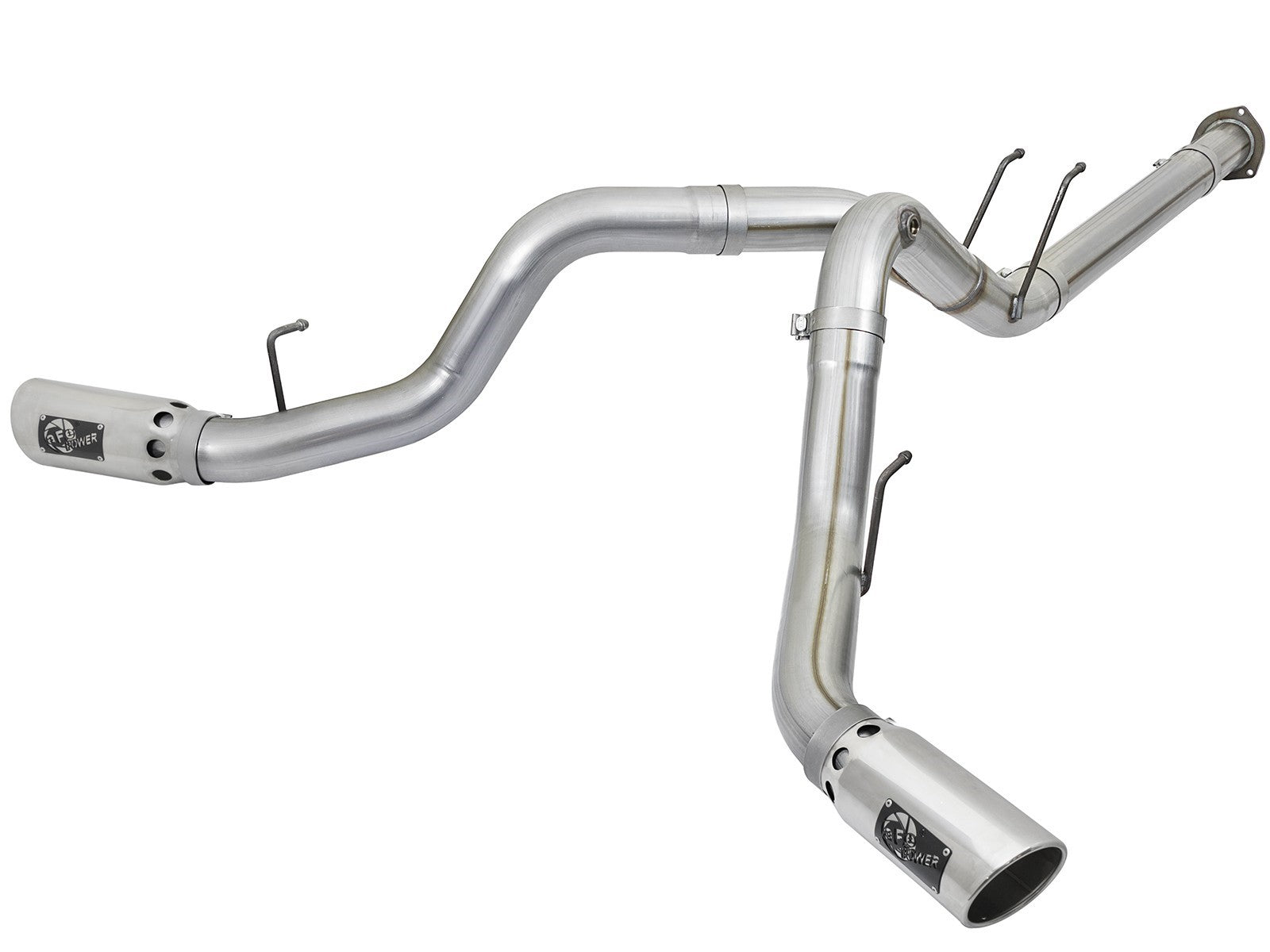 ATLAS 4 IN Aluminized Steel DPF-Back Exhaust System w/Polished Tip ATLAS 4 IN Aluminized Steel DPF-Back Exhaust System w/Polished Tip Ford Diesel Trucks 17-25 V8-6.7L (td) Flow and Performance: This ATLAS exhaust system is 100% hand MIG-welded and Constructed from 4" mandrel-bent aluminized steel tubing for maximum flow. The smooth transition bends allow for low turbulence, increasing horsepower, torque and lowering EGT's. A mitered merge collector is also incorporated to eliminate dead space that can cause turbulence and hinder flow. Perfect Fit: This system uses all factory mounting locations providing stability. Includes OE-style bayonet hangers which are used to maintain a stable pipe location during high vibration and high heat conditions. The bayonet tip holds the hanger bushing in place for an OE-style fit that does not change with time. Some cutting maybe required during install. Please see instruction sheet for Cab configuration for further details. 5" Angle-Cut Rolled Edge Polished Intercooled Clamp-On Tips: Finishing off the exhaust are dual side exit 5" stainless steel intercooled clamp-on tips with a polished finish. A unique laser-cut aFe Power logo plate is riveted on for an aggressive style. Mandrel Bent Aluminized Steel Tubing Dual Side Exit Polished Stainless Steel Clamp-On Tips Tips w/Laser-Cut Stainless Steel aFe Power Plate Uses High Quality Band Clamps And OE Style Bayonet Hangers Factory Mounting Locations Quick Hassle Free Installation Incorporates Mitered Merge Collector Intercooling Tailpipes Reduces Exhaust Gas Temps Does NOT Fit 5th Wheel Tow Package