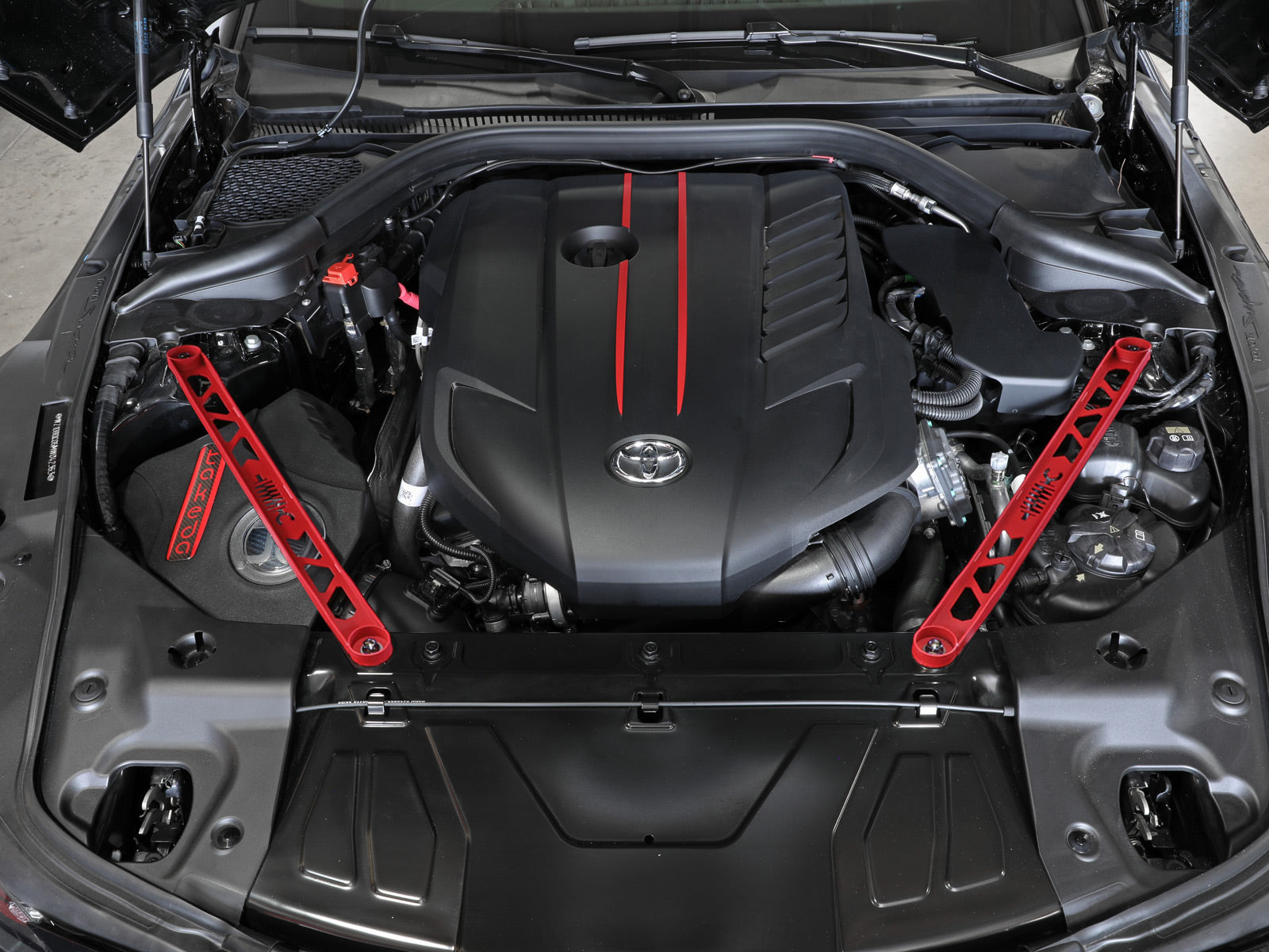 aFe CONTROL Front Suspension Strut Brace Red aFe CONTROL Front Suspension Strut Brace Red Toyota GR Supra (A90) 20-23 L4-2.0L (t)/L6-3.0L (t) aFe CONTROL fabricated suspension strut braces will stiffen up your chassis and give your engine bay a unique look. Made from 304 stainless steel, the I-beam design is TIG welded to form a lightweight brace that increases the front end rigidity and improving turn-in response.These braces are laser cut from 14-gauge 304 stainless steel and are CNC bent for a perfect fit. This kit includes grade 5 titanium mounting bolts that have an eye-catching burnt-blue anodizing. We include (4) M10 bolts for vehicles that already have factory braces and an additional (2) M8 thru bolts & nuts for the models that did not come with braces from the factory. Laser Cut, 14 Gauge 304 Stainless Steel TIG Welded I-Beam Design Grade 5 Burnt Blue Titanium Mounting Bolts Fits All Supra Models Direct Fit Installation Requires No Modifications Proudly Made in the USA