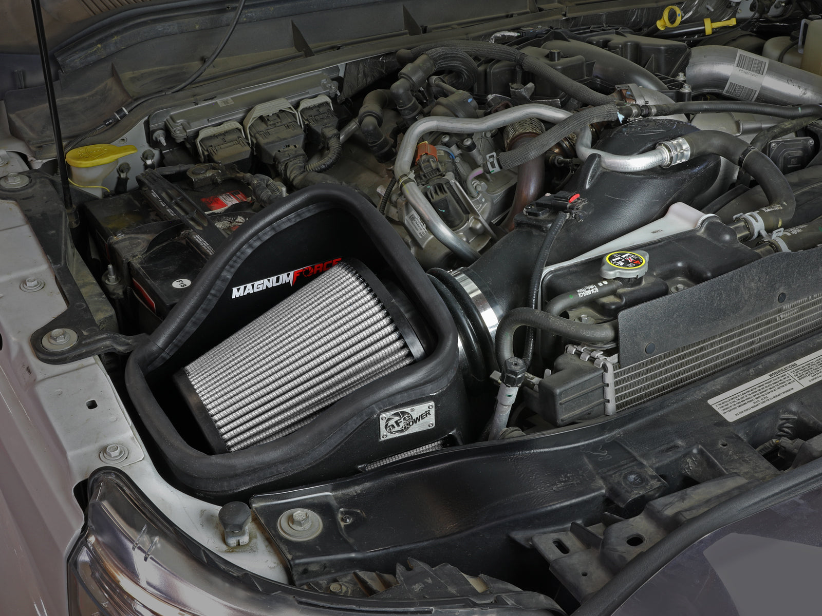 Magnum FORCE Stage-2 Cold Air Intake System w/ Pro DRY S Filter Magnum FORCE Stage-2 Cold Air Intake System w/ Pro DRY S Filter Ford Diesel Trucks 11-16 V8-6.7L (td) This 8” tall 360-degree radial flow air filter features a 5-1/2" flange and our oil-free Pro DRY S media with three layers of synthetic media for maximum convenience. Its progressive layering provides great filtration efficiency and dust holding capacity, while not requiring the use of oils. This media is best suited for street and light off-road use. Its inverted top makes for more filter surface area, resulting in longer service intervals. The included massive air filter is surrounded by an open-element XLPE (cross-linked polyethylene) polymer housing that minimizes warm engine air for maximum performance. Its open design allows for easy viewing of the air filter and delivers an aggressive Air Intake sound.This system features a high quality, computer-designed, dyno-tuned intake tube to achieve maximum power gains while maintaining a perfect fit. Its XLPE material is heat soak resistant and extremely durable. This is a direct fit intake system that utilizes factory mounting points and requires no cutting or modifications. All necessary clamps and hardware are included. The filter is mounted on a 3-angle adapter for maximum airflow and convenience. This innovative design allows for easy filter servicing, by loosening only one clamp. The Stage-2's oversized filter and open design not only draws attention, but also unleashes an aggressive turbo whistle sound when your under power. Open-Element Design Showcases the Air Filter and Delivers an Aggressive Air Intake Sound 3-Angle Filter Adapter Allows for Maximum Flow and Easy Installation/Maintenance Washable and Reusable Pro DRY S Air Filter for Maximum Convenience Utilizes Factory Mounting Locations for a Fast and Easy Installation (Roughly 30 Minutes)