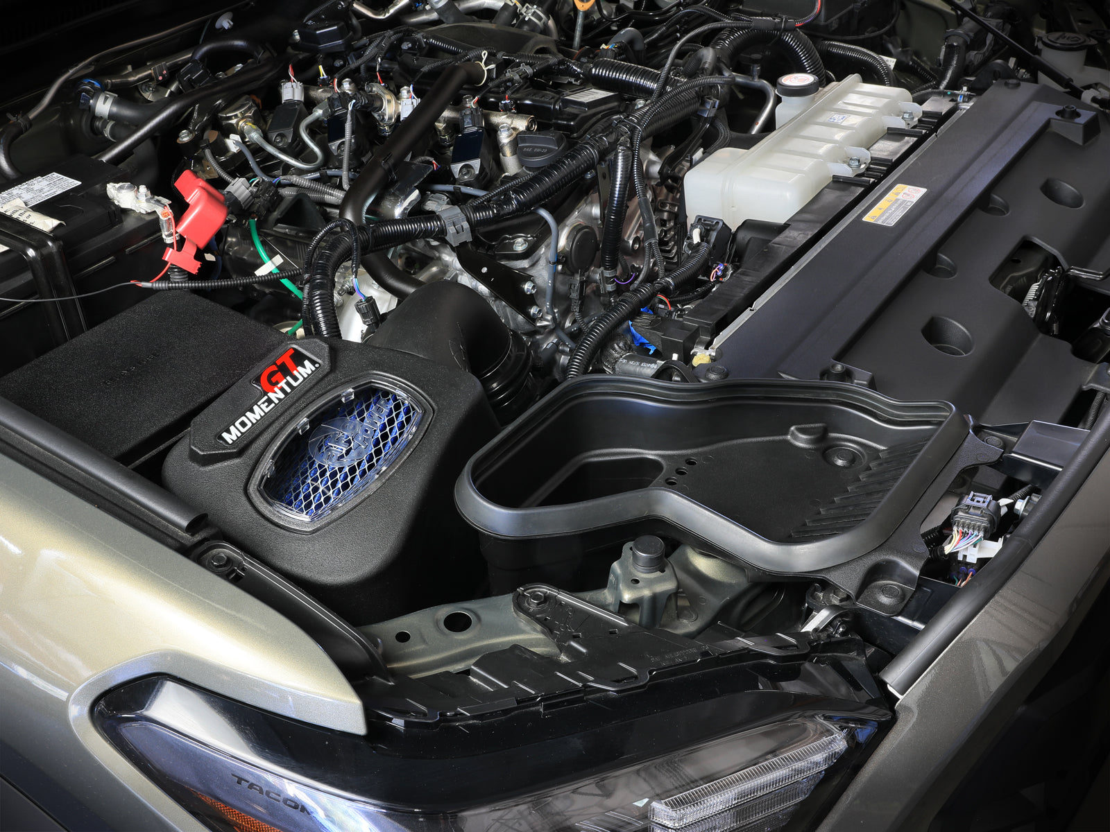 Momentum GT Cold Air Intake System w/ Pro 5R Filter Momentum GT Cold Air Intake System w/ Pro 5R Filter Toyota Tacoma 24-25/4Runner 2025 L4-2.4L (t) Momentum’s unique filter-to-housing interface was built to feature the largest air filter possible. This 8” tall, pre-oiled 360-degree radial flow air filter features a 4” flange and our pre-oiled Pro 5R media with five layers of progressively finer cotton gauze media for maximum performance. Its inverted top and large surface area provide much longer life between maintenance intervals, while reinforced metal provides maximum strength to prevent filter collapse. This media is perfect for street and/or track use. The smooth one-piece sealed housing, constructed of heat-resistant cross-linked polyethylene (XLPE), features our patent-pending filter-to-housing interface. Its innovative design minimizes the total number of parts, making for an easy installation. A clear sight window allows for hassle-free filter inspection, without having to disassemble your system. The housing connects to the factory air inlet duct but also captures air from the opening in the fender to provide more immediate cool air to the engine. This system features high quality, computer-designed, dyno-tuned intake tubes to achieve maximum power gains while maintaining a perfect fit. Their XLPE material is heat soak resistant and extremely durable. To maximize the amount of air going to this air intake system, aFe POWER D.A.S. 50-70119S is available and sold separately (Only Fits Toyota Tacoma). The Dynamic Air Scoop will replace the factory air inlet duct and provide more cold air to the air intake system directly from the front of the vehicle. Stainless-steel clamps and silicone coupler are included for strength and durability. Momentum GT intakes are designed with fewer parts for a fast and easy installation. Washable and Reusable Pro 5R Air Filter for Maximum Performance Clear Sight Window for Convenient Filter Inspection Without Disassembly Sealed Housing Captures Cool Air Optimizing Performance While Maintaining Factory Air Inlet Premium Clamps and Silicone Coupler Provide a Secure Seal and Excellent Durability Optional Dynamic Air Scoops Are Available for Toyota Tacoma To Maximize Air Flow To This Air Intake System