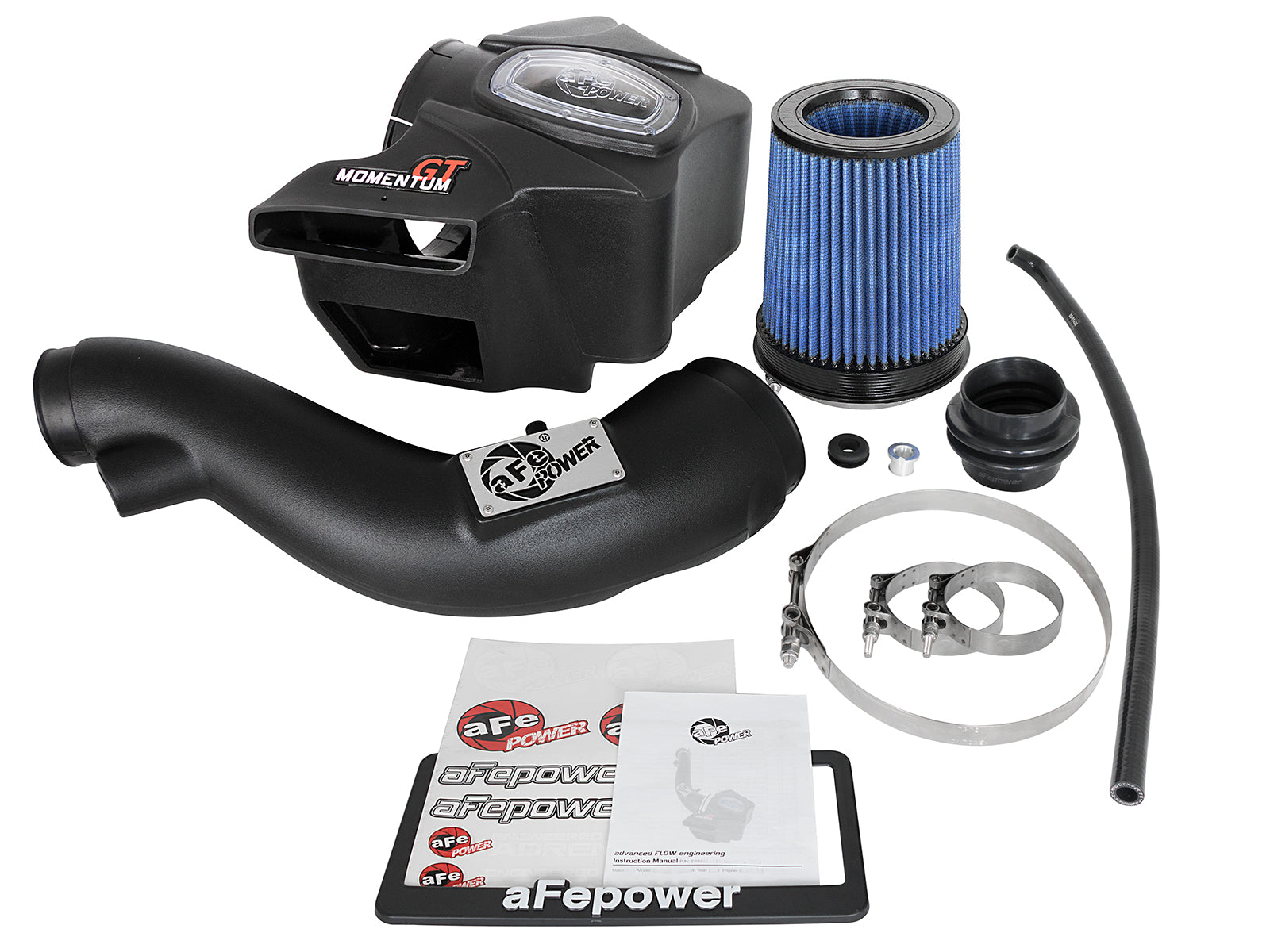 Momentum GT Cold Air Intake System w/ Pro 5R Filter Momentum GT Cold Air Intake System w/ Pro 5R Filter Jeep Grand Cherokee (WK2)/Dodge Durango 16-25 V6-3.6L Unique One-Piece Housing: The smooth one-piece sealed housing with auxiliary air scoop is used to eliminate the use of multiple-piece housings and ensure the coolest air intake charge available. A urethane plug is also included for those cold weather applications where you want to block the auxiliary air scoop. A large, clear sight window is used for a hassle-free filter inspection and an aggressive style. (US PAT 9440175) For Filter-to-Housing Interface. Roto-mold Tube: This System uses a two piece CAD designed, dyno-tuned, roto-mold intake tube to achieve maximum power gains while maintaining a perfect fit. Huge 5-Layer Performance Air Filter: The Momentum GT is designed around a pre-oiled, large 8" Tall round inverted top 360 degree radial flow performance air filter with 5-layers of progressive finer mesh cotton media providing maximum airflow and performance. The unique air filter to housing interface (patent pending) allows for maximum filter size which increases the available air volume while simplifying the installation process. Premium Hardware: Premium stainless steel T-bolt clamps and a urethane hump coupler are used for strength and durability while also providing the most secure installation available. Momentum GT intakes are designed with fewer parts for a quick and simple installation. Outflows Factory Intake By Up To 36% CAD-Designed Roto-Molded Intake Tube 1-Piece Sealed Housing w/Auxiliary Air Scoop Pro DRY S Oil-Free 3 Layer Progressively Finer Synthetic Media Built In Sight Window Provides Easy Inspection Of Filter Unique Filter-To-Housing Interface For Easy Servicing