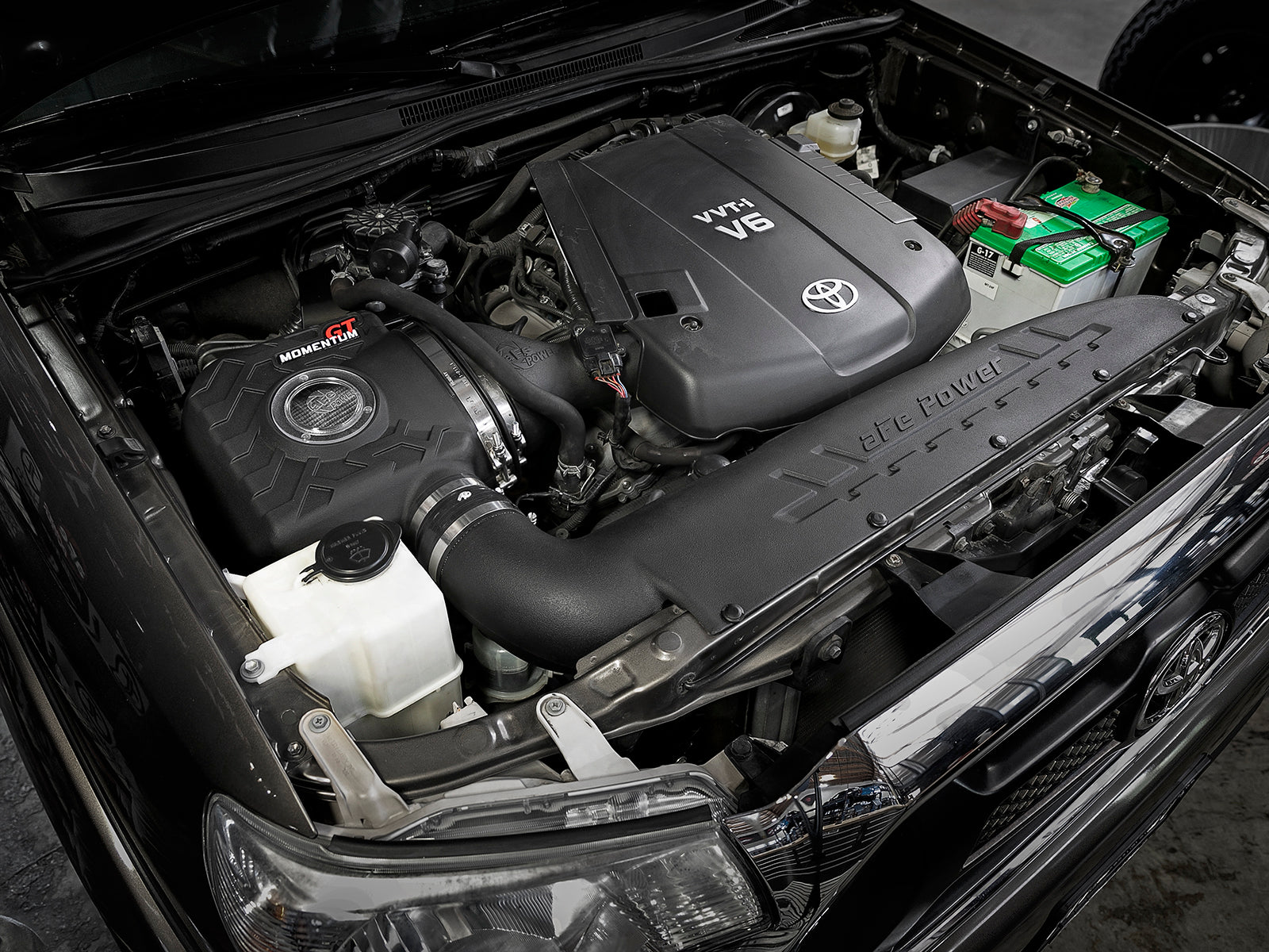 Momentum GT Cold Air Intake System w/ Pro DRY S Filter Momentum GT Cold Air Intake System w/ Pro DRY S Filter Toyota Tacoma 12-15 V6-4.0L Bringing you the next generation of intakes, aFe is proud to introduce the Momentum GT Sealed intake system for the 2012-2015 Toyota Tacoma with the V6-4.0L engine. The Momentum GT sealed air intake system is designed using the most up-to-date engineering tools and techniques to provide you with the perfect blend of power and protection. This system is superior in every way. From the one-piece sealed housing, to the massive air filter, rotomolded tube and premium hardware. Unique One-Piece Housing: The smooth one-piece sealed housing with auxiliary air scoop is used to eliminate the use of multiple-piece housings and ensure the coolest air intake charge available. A urethane plug is also included for those cold weather applications where you want to block the auxiliary air scoop. Roto-molded Tube: This System uses a CAD designed, dyno-tuned, roto-molded intake tube to achieve maximum power gains while maintaining a perfect fit. Large 3-Layer Performance Air Filter: This Momentum GT intake system was designed around the largest filter possible to allow maximum performance and filtration. This cone inverted top filter has a massive round flange and is 8" tall inverted top Pro DRY S media. The Pro DRY S performance air filter features 3-layers of progressive finer porosity synthetic media providing maximum convenience. The unique air filter to housing interface (patent pending) allows for maximum filter size which increases the available air volume while simplifying the installation process. Premium Hardware: Premium stainless steel T-bolt clamps are used to securely mount the high flow air filter to the 1-piece airbox. Momentum GT intakes are designed with fewer parts for a quick and simple installation. Outflows Factory Intake By Up To 93 Percent Built-In Sight Window Provides Easy Inspection Of Filter One-Piece Sealed Housing w/Auxiliary Air Scoop Unique Filter-To-Housing Interface For Easy Installation CAD-Designed Roto-Molded Intake Tube Oil-Free Washer/Reusable Pro DRY S Air Filter No Cutting Or Drilling On Factory Parts For Easy Installation
