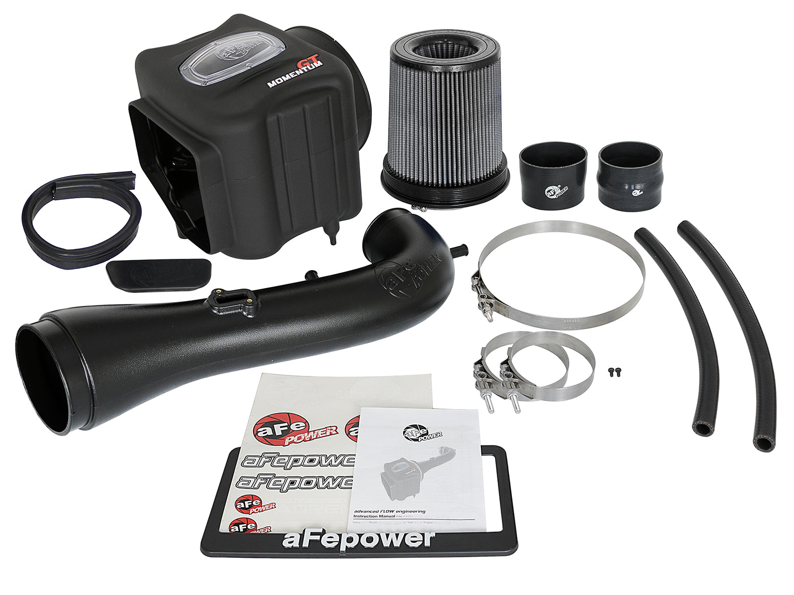 Momentum GT Cold Air Intake System w/ Pro DRY S Filter Momentum GT Cold Air Intake System w/ Pro DRY S Filter GM Silverado/Sierra 1500 14-19/Tahoe/Suburban/Yukon/XL/Escalade 15-20 V8-5.3L/6.2L Unique One-Piece High Quality Housing w/ Auxiliary Scoop: The smooth one-piece high quality sealed housing with auxiliary air inlet is used to eliminate the use of multiple-piece housings and ensure the coolest air intake charge available. A large, clear sight window is used for a hassle-free filter inspection and an aggressive style. A urethane plug is also included if you wish to block off the auxiliary air inlet. (US PAT 9440175) For Filter-to-Housing Interface. High Quality Tube: This system uses a high quality, dyno-tuned intake tube to achieve maximum power gains while maintaining a perfect fit. Custom High Temp. Silicone Coupling: A custom high temperature reinforced silicone elbow coupling with aluminum fitting is included for easy install to the factory breather line. Huge Pro DRY S Performance Air Filter: The Momentum GT is designed around a massive oil free Pro DRY S performance 360 degree radial flow air filter with 3-layers of progressive finer porosity synthetic media providing maximum convenience. and is constructed with 100% polyurethane frame for long life and multiple cleaning cycles. The unique filter-to-housing interface (patent pending) allows for maximum filter size which increases the available air volume while simplifying the installation process. Premium Hardware: Premium clamps and a silicone elbow coupling are used for strength and flexibility while also providing the most secure installation available. Momentum intakes are designed with fewer parts for a quick and simple installation. Outflows Factory Intake By Up To 30% High Quality 1-Piece Sealed Housing w/Aux. Air Inlet Pro DRY S Oil-Free 3 Layer Progressively Finer Syn. Media Built-In Sight Window Provides Easy Inspection Of Filter Unique Filter-To-Housing Interface For Easy Installation No Cutting Or Drilling on Factory Parts