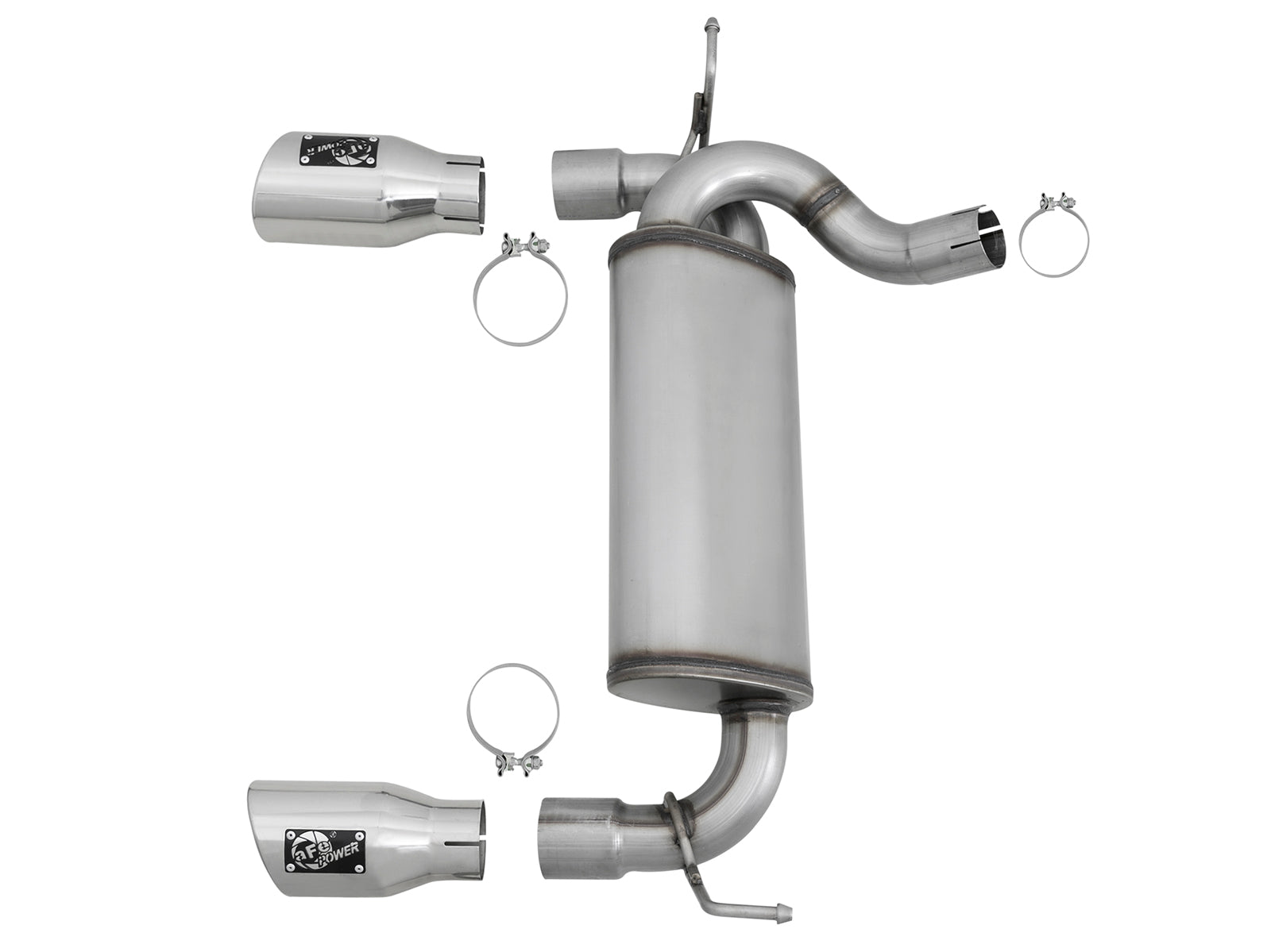 Rebel Series 2-1/2 IN 409 Stainless Steel Axle-Back Exhaust w/ Polished Tips Rebel Series 2-1/2 IN 409 Stainless Steel Axle-Back Exhaust w/ Polished Tips Jeep Wrangler (JK) 07-18 V6-3.6L/3.8L aFe's Rebel Series, dual black tip axle-back exhaust system for your 2007 - 2018 Jeep Wrangler (JK) with the V6-3.8L / 3.6L engine. This Rebel Series system is constructed with 2-1/2" mandrel bent 409 stainless steel tubing for improved exhaust flow. Utilizing factory mounting locations, the bayonet tip hangers ensure the Rebel Series exhaust has an OE-style fit and stays put under any driving conditions. A certified craftsman hand MIG welds the system for durability and longevity. High quality band clamps and hardware to provide a quick, hassle-free installation with no modifications necessary. Dual 4-1/2" angle-cut, high temp polished stainless steel exhaust tips with laser-cut aFe POWER badges to finish off the Rebel Series exhaust sys tem for the perfect combination of performance, value and style. Aggressive Sound: A free-flowing, stainless steel, 18" length muffler is used to absorb high pitch tones producing a powerful sound and unleashing more horsepower and torque potential. Dual 4-1/2" polished Exhaust Tips: This dual rear-exit system features 4-1/2" dia. high temp polished, angle-cut, rolled, stainless steel exhaust tips w/ laser-cut aFe POWER badge for a custom-styled look. Installation is a snap: This Rebel Series exhaust system uses all factory mounting locations providing stability and a hassle-free installation. Perfect Fit: OE-style bayonet hangers are used to maintain a stable pipe location during any driving conditions. The bayonet tip holds the hanger bushing in place for an OE style, long lasting fit. Leak-Free Seal: High quality band clamps are used for a complete 360-degree sealing surface. Mandrel Bent 409 Stainless Steel Free Flowing Stainless Steel Muffler Dual Rear Exit High Temp Polished Exhaust Tips High Quality Hardware and Clamps 100 Percent Hand MIG-Welded