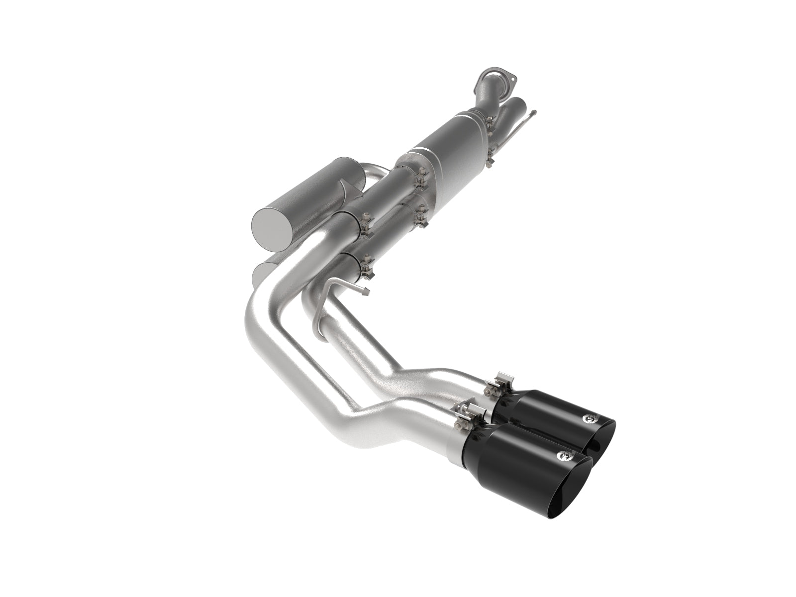 Rebel Series 3 IN 409 Stainless Steel Cat-Back Exhaust System w/Black Tip Rebel Series 3 IN 409 Stainless Steel Cat-Back Exhaust System w/Black Tip Ford F-250/F-350 17-25 V8-6.2/6.8/7.3L This cat-back exhaust system is constructed of 3" mandrel-bent 409 stainless steel tubing for maximum strength and durability. This system features a high-flow 409 stainless steel muffler and a tuned helmholtz resonator, producing an aggressive sound. Finishing off this exhaust system are dual 4-1/2" diameter black 304 stainless steel clamp-on exhaust tips. The tips features a laser etched aFe POWER logo for a unique style. This system produces an aggressive sound unleashing all available horsepower and torque. Utilizing a factory style flange and hangers this system is a direct bolt-on system, which requires no cutting or modifications for a hassle-free installation. Utilizing state-of-the-art computer-aided design technology, this exhaust system is designed for custom, high tolerance factory fitment. 100% MIG-Welded for race-proven strength and durability. Crew Cab / Short Bed - 160" Wheelbase Constructed from 3" Mandrel-Bent 409 Stainless Steel Tubing Dual 4-1/2" Diameter Black 304 Stainless Steel Clamp-On Exhaust Tips High-Flow 409 Stainless Steel Muffler Tuned Helmholtz Resonator Provides an Aggressive Exhaust Tone Utilizes Factory Style Flange and Hangers for a Secure Fit 100% MIG-Welded for Strength and Durability All Necessary Hardware is Included for a Hassle-Free Installation