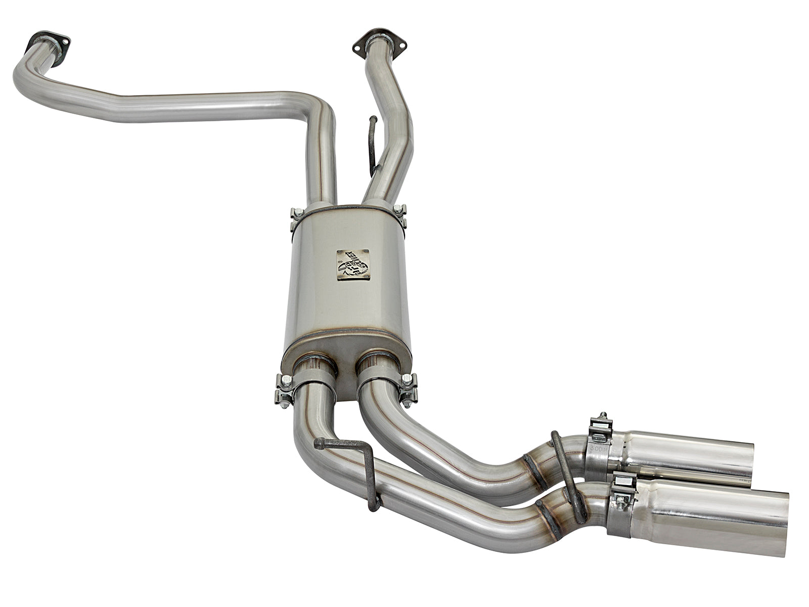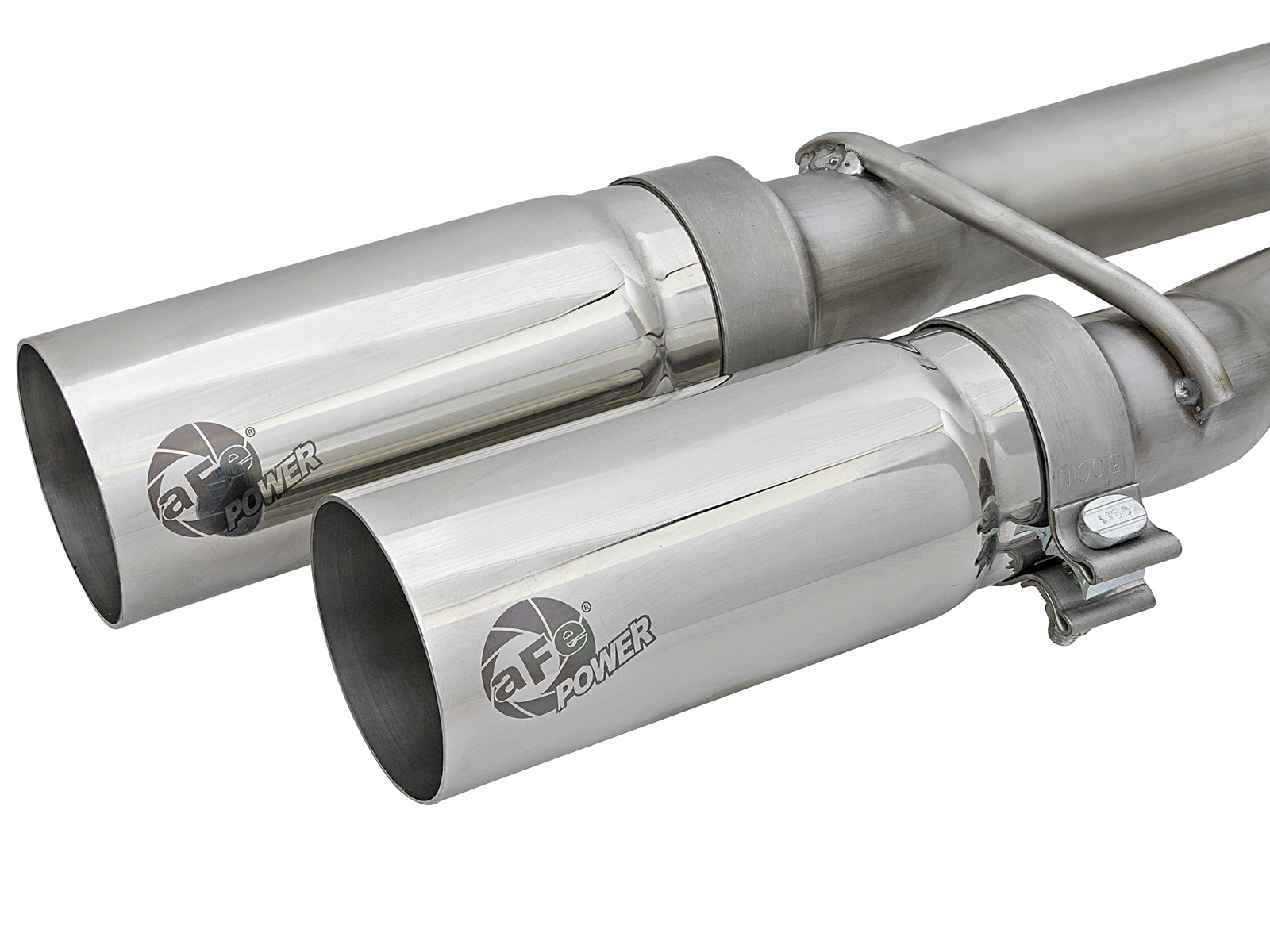 Rebel Series 3 IN 409 Stainless Steel Cat-Back Exhaust System w/Polished Tip Rebel Series 3 IN 409 Stainless Steel Cat-Back Exhaust System w/Polished Tip Nissan Titan 04-15 V8-5.6L aFe Power introduces an all new Rebel Series dual middle-side exit exhaust system for the 2004-2015 Nissan Titan with V8-5.6L engine. This Rebel Series cat-back is designed with dual black exhaust tips that exit in front of the rear passenger tire for a unique, aggressive look. The tips come with unique laser-etched aFe Power logos on the side and are constructed from stainless steel for durability. The exhaust system is constructed from 2-1/2" MIG-welded, mandrel bent stainless steel tubing for maximum flow, increased horsepower and torque. This kit uses a free-flowing muffler to absorb high pitch tones producing a powerful sound. The performance cat-back exhaust system includes necessary hardware and clamps for a hassle-free install, with no cutting required making it a true bolt on system. 3-1/2" Dia. Black Middle-Side Exit Tips: Finishing off the exhaust are dual 3-1/2" diameter black 304 stainless steel clamp-on tips with a laser-etched aFe power logo on the side for an aggressive style. The tips are designed to exit from in front of the rear passenger side tire for a unique custom look. Installation Is A Snap: This Rebel Series exhaust system uses factory mounting locations providing stability and hassle-free installation. Leak-Free Seal: High quality band clamps are used for a complete 360-degree sealing surface eliminating leak paths. Aggressive Sound: A free-flowing stainless steel muffler is used to absorb high pitch tones producing a powerful sound and unleashing all available horsepower and torque. Perfect Fit: OE-style bayonet hangers are used to maintain a stable pipe location during high vibration and high heat conditions. The bayonet tip holds the hanger bushing in place for an OE-style fit that does not change with time. This makes for an easy installation with no cutting required. Mandrel Bent Stainless Steel Tubing High Flow Stainless Steel Dual-In To Single-Out Muffler Aggressive Sound Bayonet Style Hangers For Secure Fit Heavy Duty Band Clamps Complete w/Necessary Hardware Passenger Side Exit Middle Exit Dual Polished Stainless Steel Tips w/aFe Power Logo