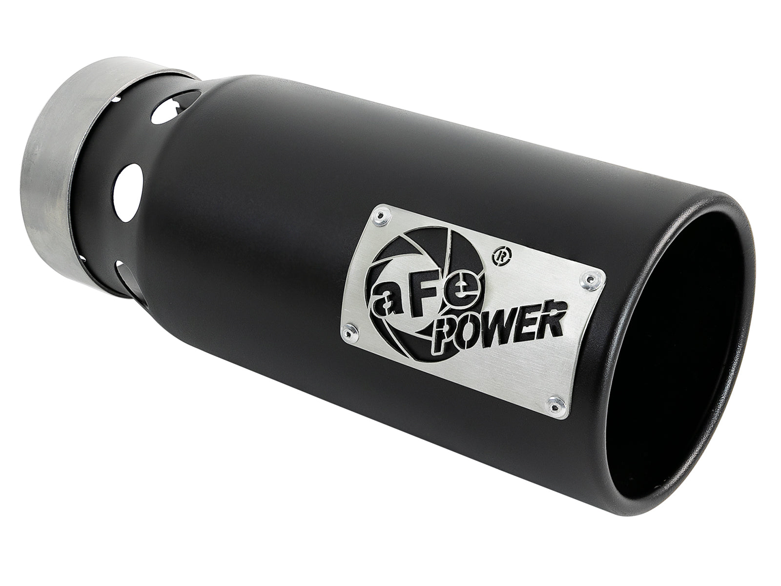 SATURN 4S 409 Stainless Steel Clamp-on Exhaust Tip Black - Right - Exit SATURN 4S 409 Stainless Steel Clamp-on Exhaust Tip Black - Right - Exit 4 IN Inlet x 5 IN Outlet x 12 IN L aFe Power is proud to introduce an all new intercooled exhaust tip. This tip comes with a black finish and is designed to fit 4" exhaust systems. With a 4" inlet x 5" outlet and 12" inch length, this single-walled, angle cut rolled tip comes with intercooling vents and a unique laser-cut aFe Power logo plate riveted on for an aggressive style. Intercooled Vents: This tip comes with intercooling vents designed to reduce exhaust gas temperatures at the tailpipe. Leak-Free Seal: A high quality stainless steel band clamp is used for a complete 360 degree sealing surface. aFe Badging: The exhaust tip comes with a unique laser-cut aFe Power logo plate riveted on for an aggressive style Fits 4 in. Exhaust Systems Slotted For Secure Mounting High Quality Band Clamp Unique Laser-etched aFe Power Logo