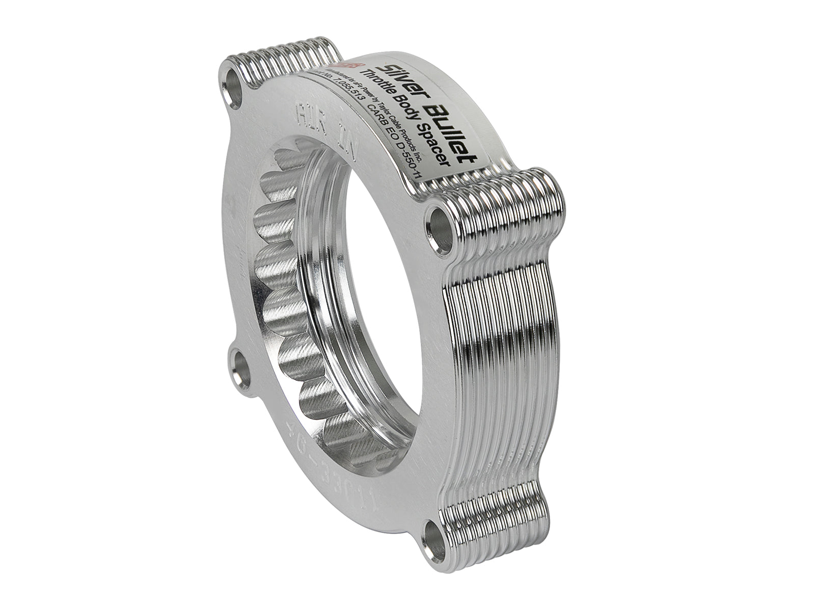 This aFe Silver Bullet throttle body spacer installs between the throttle body and intake manifold on Ford trucks with 6.2L V8 engines. It fits 2010-2014 F-150 including Raptor plus 2011-2016 F-250 and F-350 Super Duty models. The helix design generates air turbulence for better fuel atomization higher horsepower torque faster throttle response and improved fuel efficiency without any whistle noise.