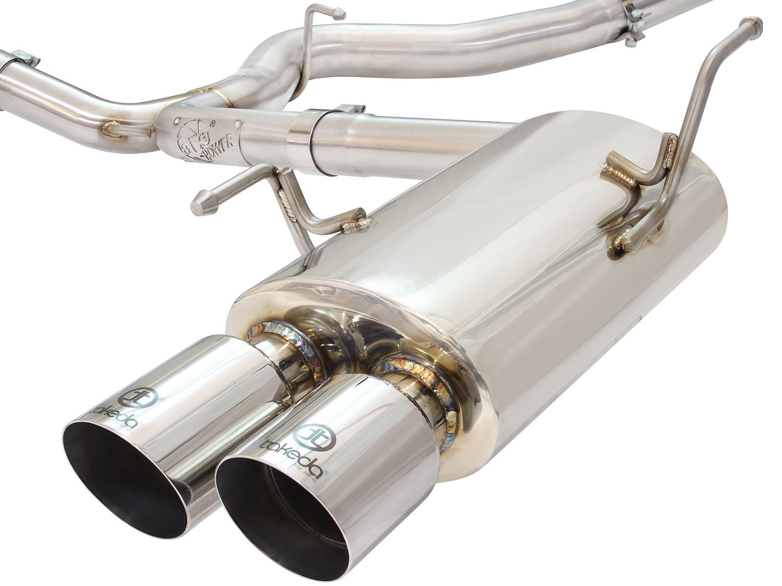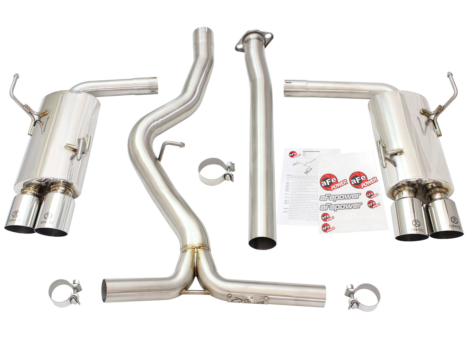 Takeda 3 IN to 2-1/4 IN 304 Stainless Steel Cat-Back Exhaust w/ Polished Tip Takeda 3 IN to 2-1/4 IN 304 Stainless Steel Cat-Back Exhaust w/ Polished Tip Subaru WRX/STi 15-21 H4-2.0/2.5L (t) aFe is proud to introduce an all new Takeda dual cat-back exhaust system for the 2015-2020 Subaru WRX and WRX STI with the H4-2.0L/2.5L (t) engines. This performance cat-back exhaust system is constructed out of 3" into dual 2-1/4" mandrel-bent 304 stainless steel tubing and incorporates a mitered merge to evenly distribute exhaust gases resulting in added horsepower and torque. In testing, this system resulted in gains up to +14 horsepower and +22 lbs. x ft. of torque verified by our in house dyno. This cat-back exhaust utilizes dual high-flow 304 stainless steel mufflers to improve performance across the power band while maintaining an aggressive sound. To finish off the exhaust are quad, 304 stainless steel, high-luster, polished 3-1/2" diameter tips. The tips come with laser-etched Takeda logos for an aggressive style. This unit is 100% TIG-Welded by certified craftsmen for race proven strength and durability and is a direct bolt-on system that requires no modifications. All necessary hardware is included for a hassle-free installation. Direct Bolt On High Quality Hardware 100% TIG-Welded Hassle Free Installation