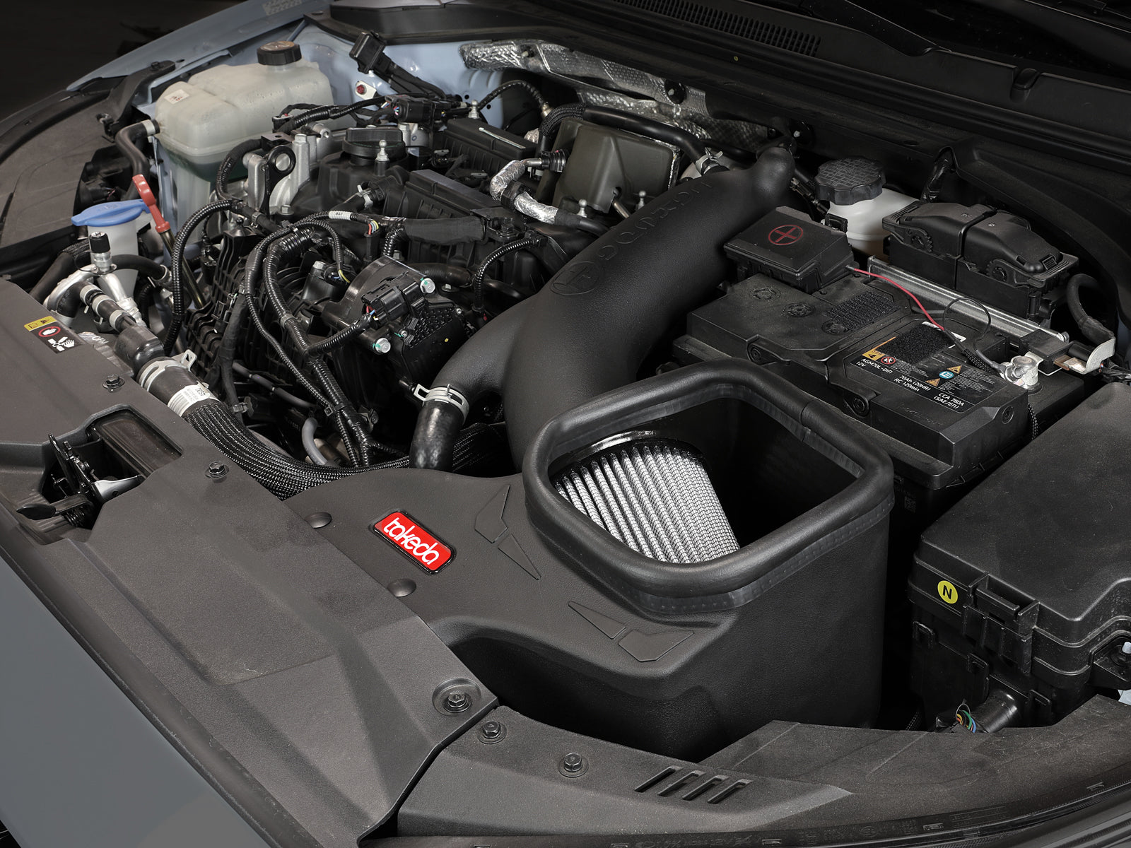 Takeda Stage-2 Cold Air Intake System w/ Pro DRY S Filter Takeda Stage-2 Cold Air Intake System w/ Pro DRY S Filter Hyundai Veloster N 19-22 L4-2.0L (t) Large Three Layer Performance Air Filter: This 360-degree radial flow air filter features a 4" flange and our oil-free Pro DRY S media with three layers of synthetic media for maximum convenience. Its progressive layering provides great filtration efficiency and dust holding capacity, while not requiring the use of oils. This media is best suited for street use. Its inverted top makes for more filter surface area, resulting in longer service intervals. Dyno-Tuned Intake Tube: This system features a high quality, computer-designed, dyno-tuned intake tube to achieve maximum power gains while maintaining a perfect fit. Its XLPE material is heat soak resistant and extremely durable. It features a Takeda design inspired by import vehicles. One-Piece Housing: The included massive air filter is surrounded by an open-element XLPE (cross-linked polyethylene) polymer housing that minimizes warm engine air for maximum performance. Its open design allows for easy viewing of the air filter, yet creates a heat-blocking seal when the vehicle's hood is closed. It features an incorporated scoop to capture air from the front of the vehicle. Hassle-Free Installation: This is a direct fit intake system that utilizes factory mounting points and requires no cutting or modifications. All necessary clamps, couplings, and hardware are included. Its revolutionary design, featuring our patent pending filter-to-housing interface, uses half the number of parts of a traditional cold air intake system. Included billet aluminum fittings allows stock connections to transfer over seamlessly. Outflows Factory Intake by 30% Measured Flow: 260 CFM @ 7 IN H2O Open-Element Design Allows For Viewing of Massive Air Filter One-Piece Housing Captures Air Directly from Behind Front Grille Innovative Filter-to-Housing Interface for Easy Installation
