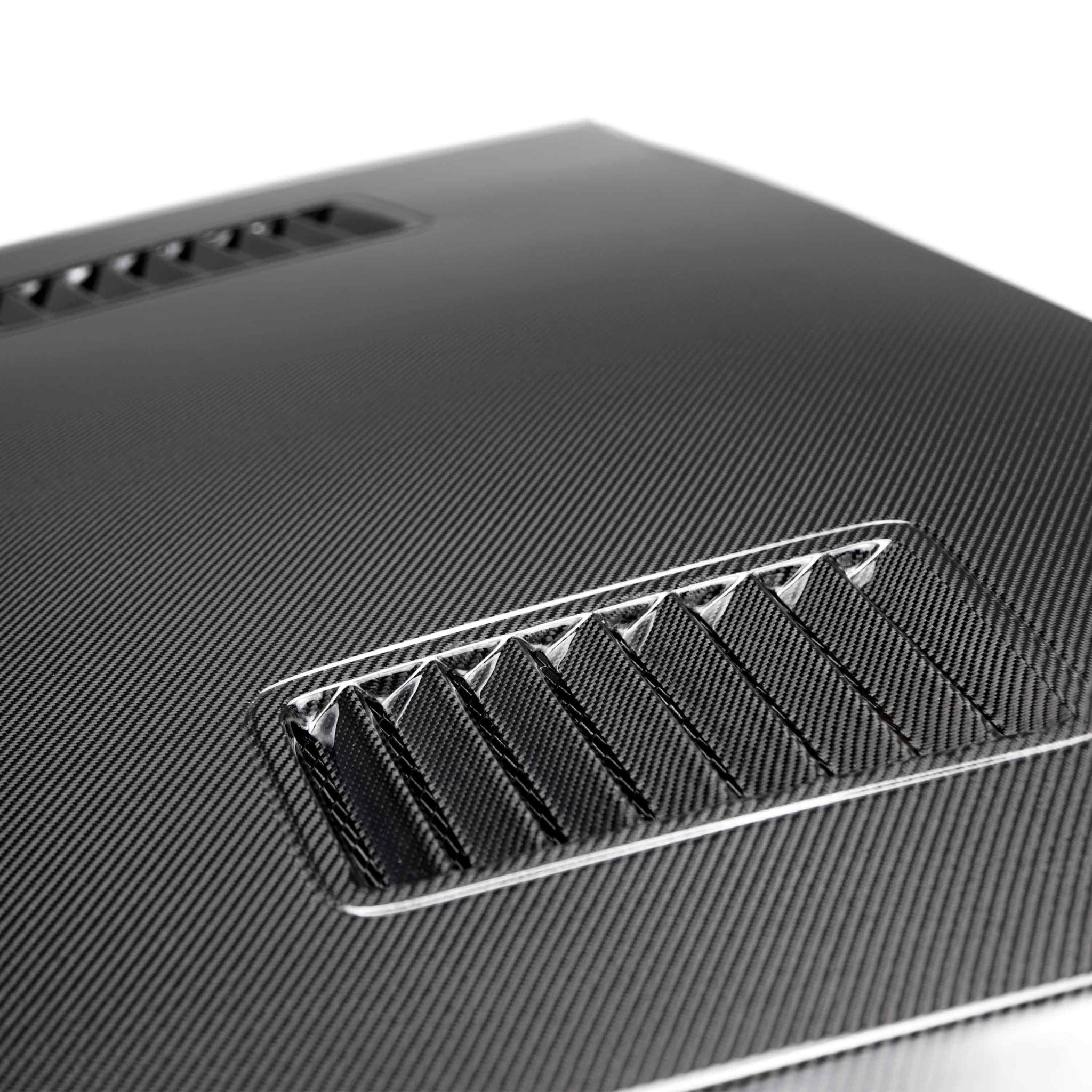 2018-2023 Ford Mustang with the Type-SN Double Sided Carbon Fiber Hood from Anderson Composites. Handcrafted using a vacuum-infused 3K, 2x2 twill carbon fiber cloth, this high-performance hood reduces weight while maintaining OEM fit and finish. Perfect for enthusiasts seeking a track-ready aesthetic and improved performance.