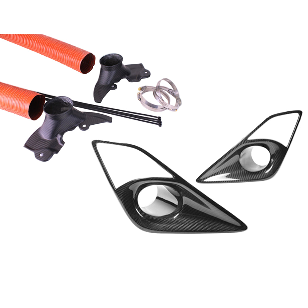 The APR Brake Rotor Cooling Kit, designed specifically for 2013-2016 models. This precision-engineered kit channels high-pressure, high-velocity air directly to your brake rotors, ensuring consistent cooling during intense track sessions. By leveraging the venturi effect, the ducts efficiently direct substantial airflow from the vehicle's frontal area through a narrowed passage, significantly reducing brake rotor temperatures lap after lap. Crafted from pre-preg carbon fiber reinforced polymer (CFRP), this kit combines lightweight construction with robust durability, delivering both function and a sleek aesthetic. Finished with a UV-resistant clear-coat, the ducts maintain their pristine appearance under harsh environmental conditions with proper care, such as regular polishing and waxing.