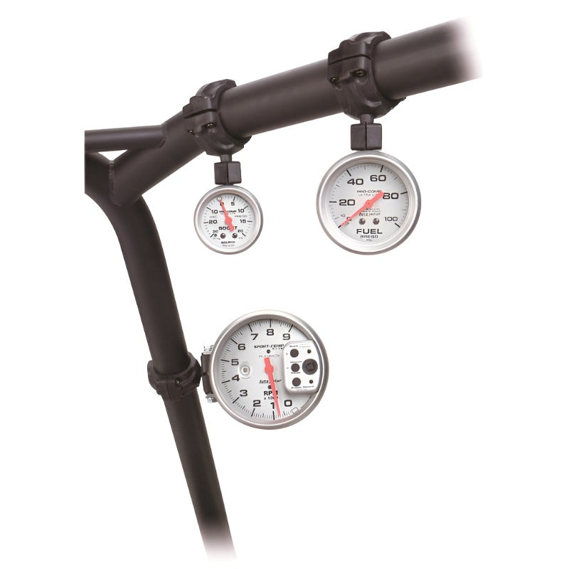 If you have been struggling with where to place a few critical instruments in the already cramped interior of your roll cage-equipped vehicle,AutoMeter Roll Pods may be the perfect solution! Available to fit a variety of popular gauge and cage dimensions,these durable mounts clamp securely to your existing roll bar tubing ensuring a shock and vibration resistant attachment point for your instrument. Ball and socket joint design allows for 360 degrees of rotation between gauge and clamp to accommodate a variety of bar orientations and installation points. Additional angle and pitch adjustments ensure you can fine-tune your installation to eliminate parallax error and place your gauges where it is easiest for the driver to view them. Manufactured from rugged black fiber-reinforced composite,these mounts provide a solid and professional look for everything from racecars to off road vehicles and UTVs.