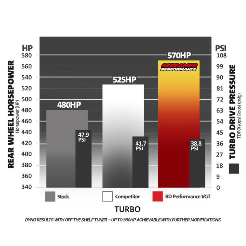 A drop-in stock installation, stock looking replacement that is anything but stock! The larger Ballistic billet compressor wheel and our exclusive turbine profile results in reduced backpressure and increased turbine flow compared to the competition. This results in increased potential maximum power output, right up to 690 horsepower with performance modifications.