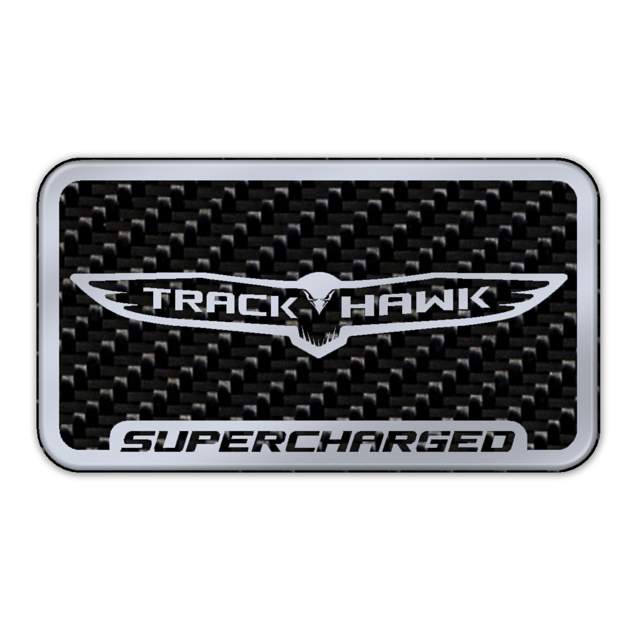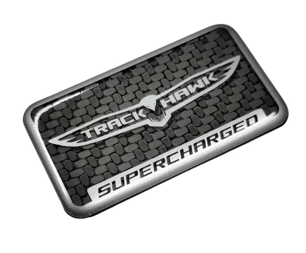 Carbon Fiber Trackhawk Supercharger badge features genuine carbon Fiber and Silver accents.