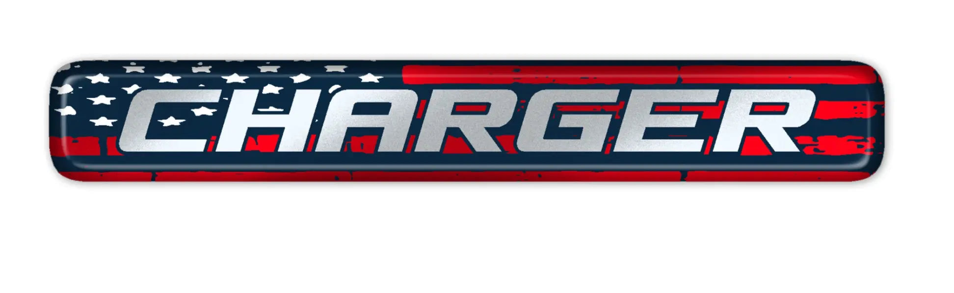 "CHARGER PATRIOT PACK" DASH BADGE comes in silver lettering on a gloss black background and your choice of 12 available colors to match the hash marks to your car's color scheme.