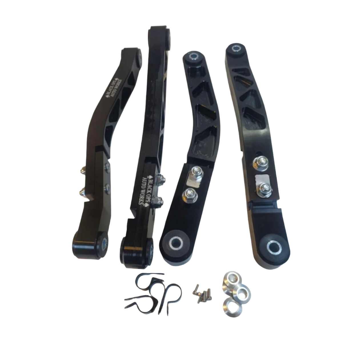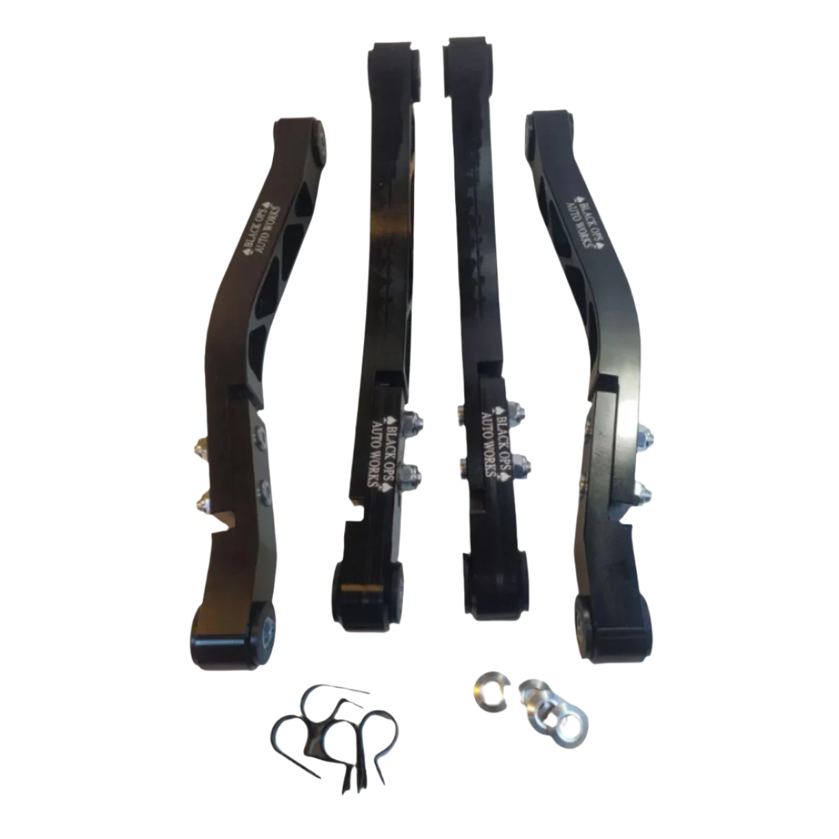Each arm is precision machined from solid Blocks of 6061 billet aluminum and the tabs are laser-cut from steel and plated for an exact fit. By changing out the tabs with different offsets, you can tune the alignment of your vehicle to suit your needs whether you're trying to increase or reduce camber.