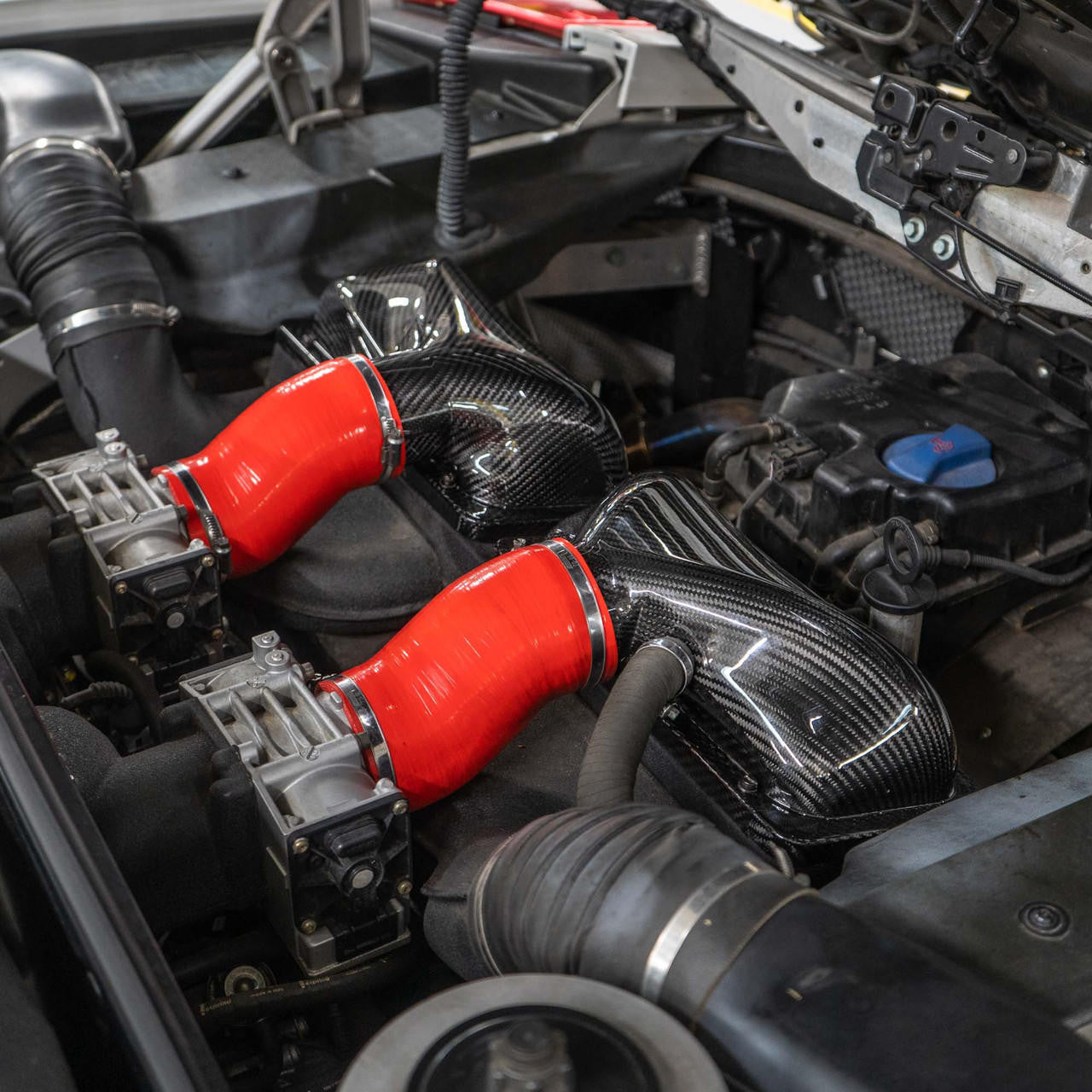 High-performance carbon fiber air box cover works with the factory airbox to increase power and improve the engine bay look.
