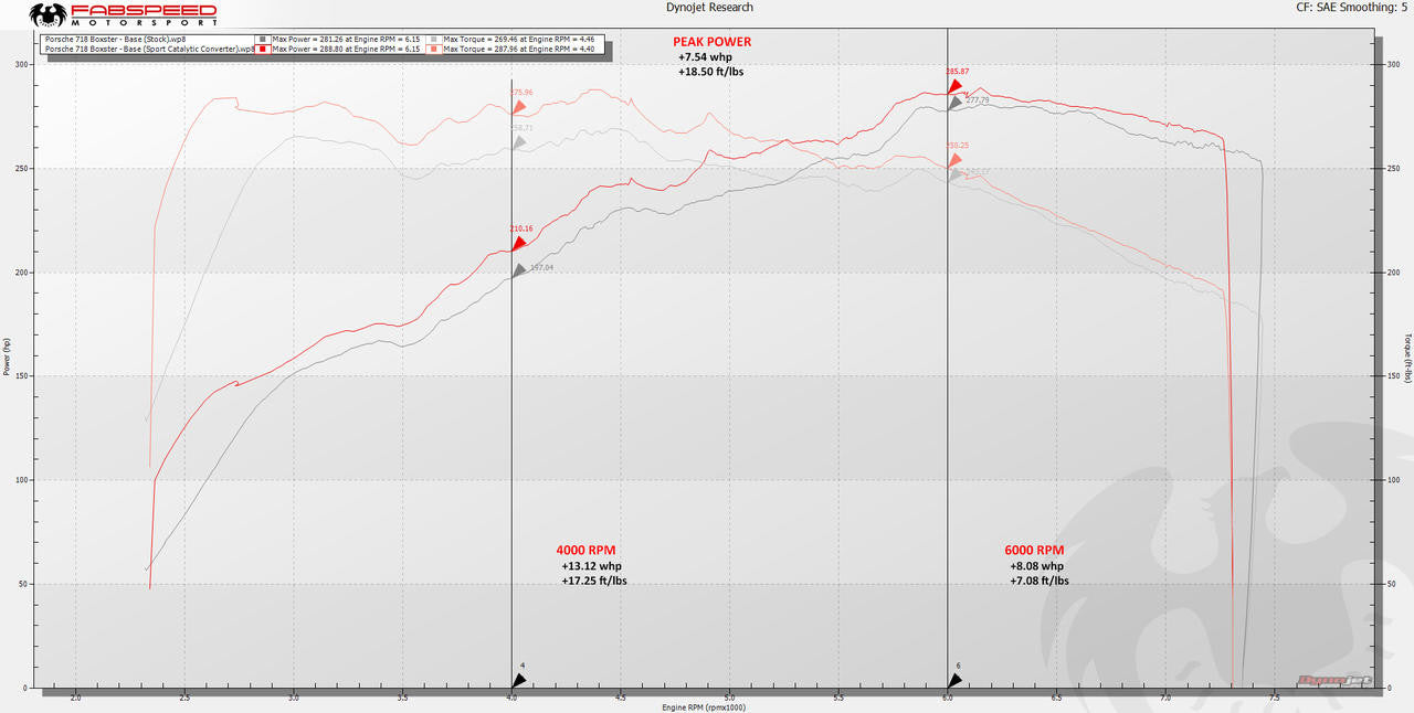 The addition of Fabspeed's Sport Catalytic Converter added 8.5 HP and 18 ft-lbs of torque peak power gains when tested on our Dynojet on a stock vehicle. 13 whp and 17ft-lbs at 4000 will make a significant difference in drivability. We look forward to extracting even more power with our hardware in conjunction with a tune at a later date.