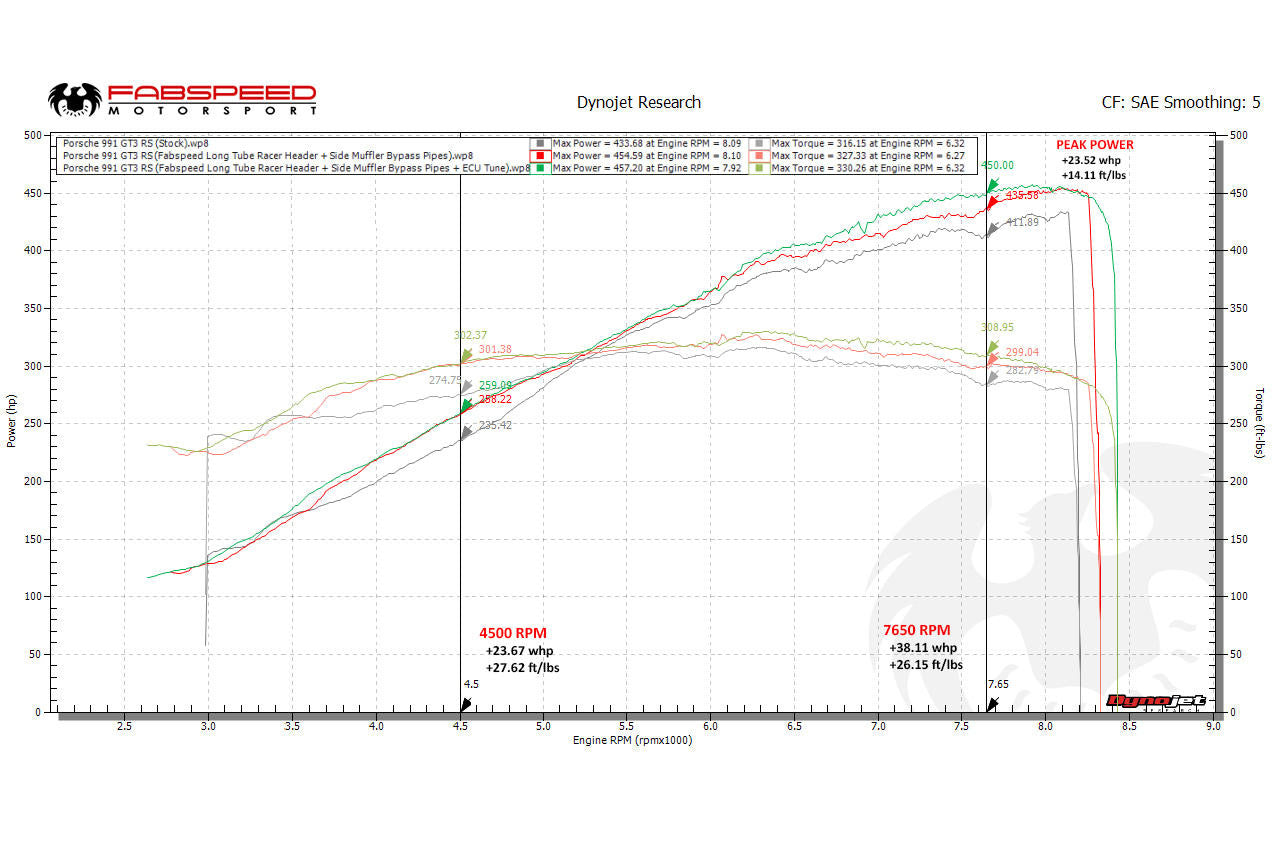 We developed our headers to make power with and without an ECU Tune. While the hardware made significant gains alone, we found its full power potential was realized when combined with our proprietary tune. As tested on a GT3 RS, our Long Tube Competition Race Header System with ECU Tune adds 38 whp and 26 ft/lbs of torque at 7650 RPM. Further down the rev range, our Header System gives you major mid range grunt: 24 whp and 28 ft/lbs of torque at 4500 RPM. Without the ECU Tune, you can expect solid gains of 24 whp and 16 ft/lbs at 7650 RPM and 23 whp and 26 ft/lbs at 4500 RPM. Any 991 GT3 becomes an absolute unleashed tiger with our Fabspeed Motorsport competition header system.