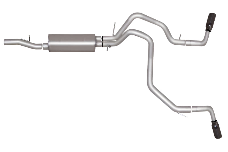 For the extremist who wants to take their truck to the next level, this dual bolt-on Cat back system is for you. This system exists behind the rear tires at an aggressive angle with a powerful exhaust tone. You will gain bold street looks with powerful dyno tuned and tested street performance gains. You can expect to experience gains on average of 15-20 horsepower. Gibson muffler provides a mean performance sound and complemented with polished Stainless Tip. Easy bolt-on installation. No welding required. Backed by a Lifetime Limited Warranty. If you want Extreme, this system is it.