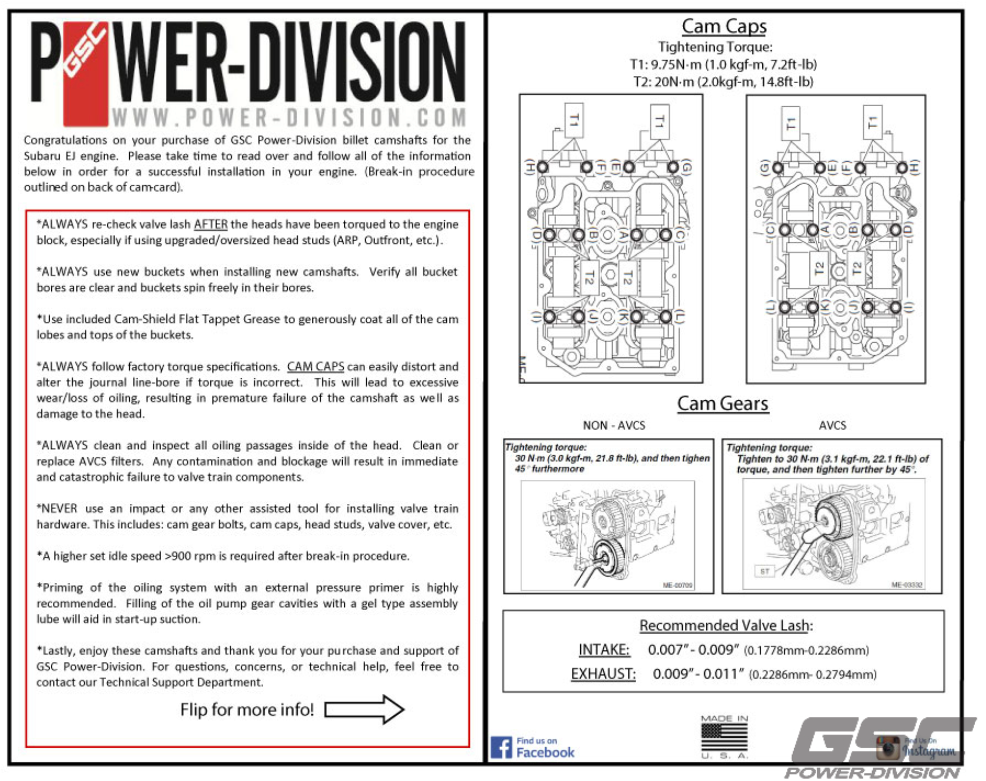 GSC Power-Division billet S2 camshafts for the 08+ Subaru STi EJ257 with Dual AVCS. These cams are built to suit the higher horsepower Subis. With a power range of 500 WHP and up, you need some certain mods to utilize the true potential of the S2s: built motor, with a built/ported head, and a good engine management system. Upgraded valve springs are required; beehive valve springs are recommended but not required.