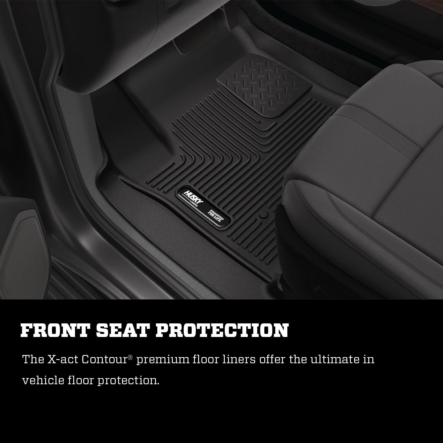 Husky Liners 52741 X-act Contour front floor liners deliver laser-scanned exact fit for 2014-2017 Chevrolet Silverado 1500 Standard Cab and compatible GMC Sierra/Chevy HD regular cab models. These two-piece black liners feature DuraGrip no-slip surface and StayPut nibs for secure hold using factory anchors. Built with ProCore material to resist chemicals, contain spills with FormFit Edge, and maintain shape for lifetime protection.