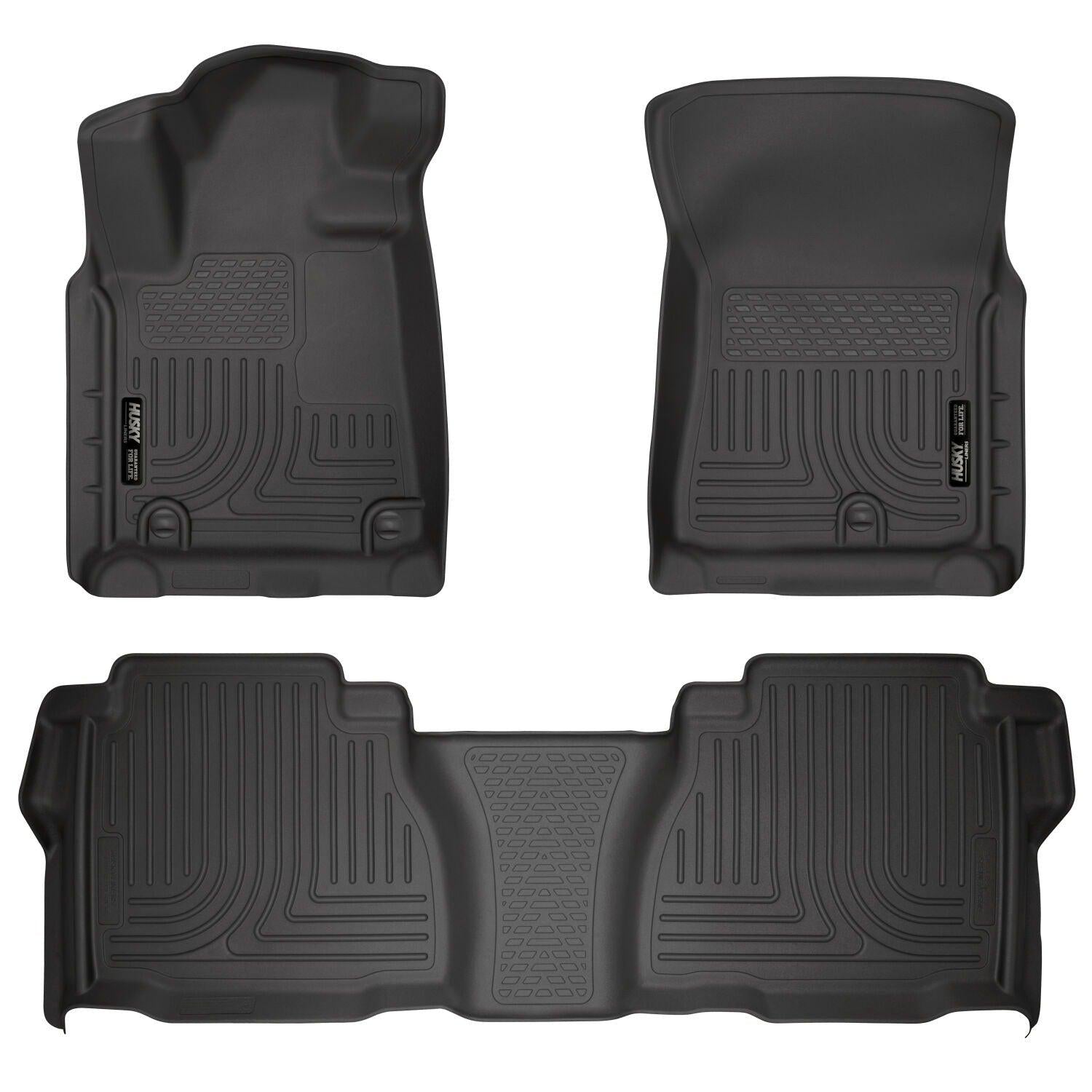 Husky Liners 99581 delivers custom-fit protection for 2014-2021 Toyota Tundra CrewMax models with Weatherbeater front and second row floor liners in black. These 3-piece liners use laser-scanned FormFit Design for precise contours and raised FormFit Edge to trap spills. Built tough against chemicals, extreme temperatures, and daily abuse while locking securely with StayPut Nibs.