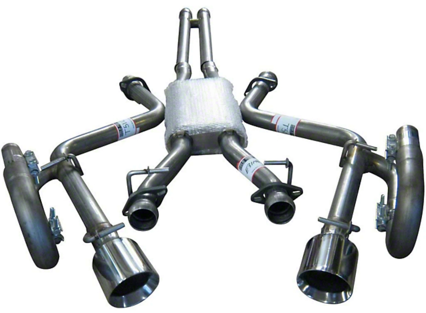 Front Muffler Assembly: 2¼” mandrel bent T409 stainless steel exhaust pipes combined with our dual in, dual out T304 stainless steel Mach-X muffler. This is a true X-design muffler that is 14″ long with a 4″ X 9″ body. The X-design calms the noise and smoothes out the rough RPM ranges while remaining free flow.