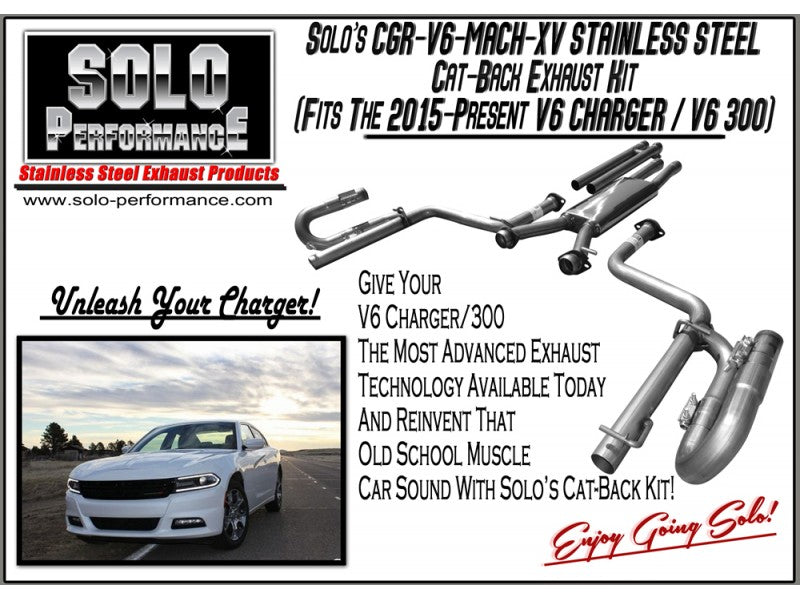 Raw American muscle on the outside and a refined, non-invasive performance exhaust note on the inside. The dramatic sound difference from outside to inside is accomplished by months of research and development as well as specific product design for the 2015 – Present V6 Charger/300 SXT. This is a “sound on demand” system in that it is relatively quiet once you’re at cruising speeds and the deep, raw, rich exhaust note comes alive when you accelerate. Fit, form and function are the cornerstones of our Solo Performance Charger/300 dual exhaust kit. The Solo CGR-V6-MACH-XV Charger/300 SXT exhaust kit is a 2 1/4″ mandrel bent, free flow stainless steel converter back exhaust. It incorporates an H-Pipe in the front section, our Mach-XV X-Design muffler in the mid-section and Solo tunable J-Pipes in the rear. These J-Pipes are specifically designed to work with the 2015+ Charger/300 V6 drone producing ranges to eliminate them, leaving you with the 60’s muscle car sound you deserve. There are no exhaust tips with this kit as the Charger / 300 stock setup is used. All of us at Solo Performance are very proud to bring to the Charger / 300 community our free-flow CGR-V6-MACH-XV exhaust kit.
