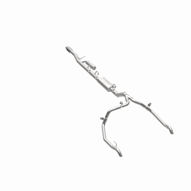 The MagnaFlow Chevrolet Silverado 1500/GMC Sierra 1500 Overland Series Cat-Back Performance Exhaust System #19626 is engineered to enhance the off-road capabilities, performance and sound of your 2019-2023 Chevy Silverado 1500 or GMC Sierra 1500 equipped with the 6.2L engine option. The high clearance design of this exhaust kit increases your rig's capacity to traverse any sort of terrain, while the incorporation of an NDT (No Drone Technology) resonator helps mitigate the droning frequencies that can otherwise occur at highway cruising speeds. #19626 features 3.5 in. diameter main piping that passes through an 18 in. oval bodied straight-through muffler and 14 in. NDT reflection chamber before terminating in a dual split rear exit with high clearance tailpipes. Exhaust kit #19626's easy-to-install direct-fit design is engineered to replace all of your truck's stock exhaust components from near the catalytic converter on back. This Chevrolet Silverado 1500/GMC Sierra 1500 performance exhaust system is made of durable, corrosion resistant stainless steel and produced using advanced CNC precision robotic manufacturing techniques, all backed by MagnaFlow's limited lifetime warranty.