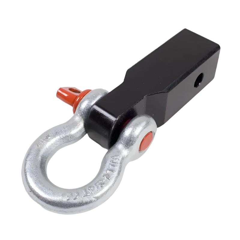 This heavy-duty steel design fits into any 2 Inch receiver box. It is rated up to 9;500 lbs. pulling capacity on evenly distributed straight pulls. Note: never exceed your receiver capacity. Not designed for towing. Does not include hitch pin.