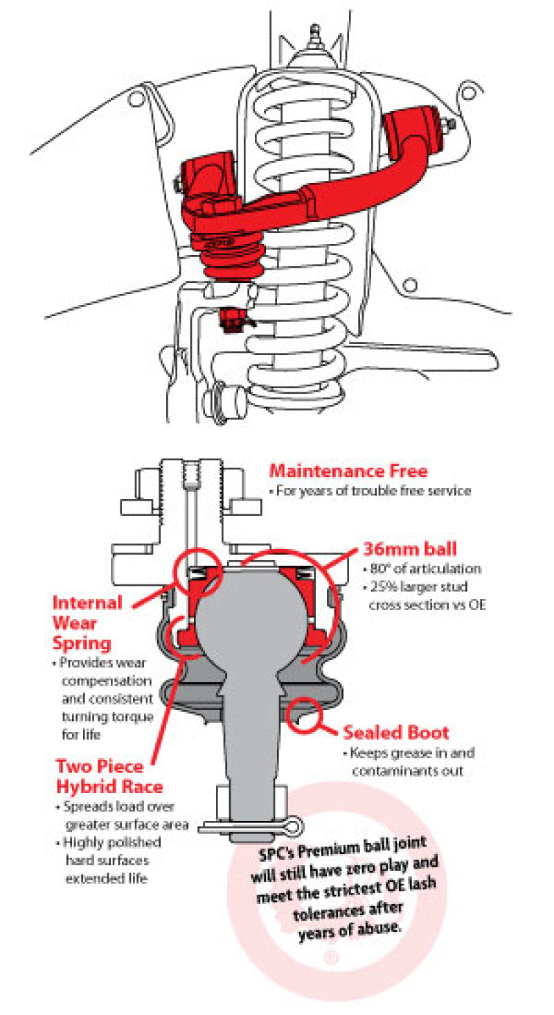 Improve droop travel, drivability and tire wear as well as adjusting tire position in your wheel well with SPC's adjustable front upper control arms on many Toyota trucks and SUVs. Featuring our long-life maintainable ball joint and SpecRide bushings, this arm is designed to correct alignment angles while maintaining factory ride quality. SPC's integrated tubular and cast steel design provides the strength and durability needed for the most demanding environments. These remove and replace arms are available in pairs for lifted and off-road applications. Get more droop travel: SPC's arm has improved clearance to get around the spring bucket when the arm droops, eliminating arm to frame contact on lifted trucks. The maintainable ball joint has an oversized ball and allows more than 80° of articulation to ensure it never binds. SpecRide bushings have free pivot to eliminate any chance of bushing failure seen on many high travel suspensions. Get your drivability and tracking back: When you lift your truck you affect caster and camber. SPC's arms have +1° of caster built into them. Using its patented ball joint design, the arm will get you 0° to +4° of caster and ±2° of camber. Get your tire where you want it in the wheel well: Use adjustment in the control arm and on the OE lower cams to maximize alignment angles and move oversized tires forward in the wheel well to minimize or avoid fender trimming. Do you need replacement cams for the lower control arm? Check out SPC p/n 25445, which will replace corroded cam bolt assemblies. On the adjustable ball joint SPC uses hex chromate free finish and offers a 700hr salt spray finish for the best corrosion protection available.