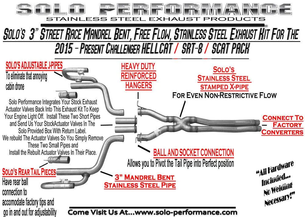 Solo Performance is proud to introduce its 2015+ Challenger Hellcat, Scat Pack, SRT-8, 3″ catback stainless steel exhaust kit. We have worked very hard to engineer this exhaust kit that not only sounds incredible but is drone free. Raw American muscle on the outside and a refined, non-invasive performance exhaust note on the inside. The dramatic sound difference from outside to inside is accomplished by months of research and development plus specific product design. Fit, form, and function are the cornerstones of our Solo Performance SRT, Hellcat, Scat Pack exhaust kits. The Street-Race-XV kit offers a free flow 60’s muscle car sound and the Street-Race kit is our loudest kit for this application. The Solo Hellcat Street Race kit has an X-Pipe and no muffler. The Street Race is a very aggressive, deep and much louder than the stock exhaust note. There are actuator exhaust valves in the stock exhaust that cannot be eliminated without triggering an engine light. We include a prepaid return box for these valves to be sent back to us so that we can rebuild them to fit into our exhaust kit. We have a short 7” straight stainless steel piece that has a flange on the front and a clamp connection at the back that goes right after the front muffler assembly and in front of the tailpipe assembly. Just install this piece while you send your stock actuator exhaust valves back to us and you can drive it worry free. Once we receive the valves we will rebuild them within the day and send them back to you. Once you get the rebuilt valves they will fit perfectly into the 7” area mentioned above. It will be the exact same flange and clamp connection. Note: If you choose to weld the valves in on your own, just choose that order option for $50 less. The tailpipe assembly comes with Solo’s tunable J-Pipes. These J-pipes are capped off on the end, and as the sound waves enter the J-pipe they bottom out on the end cap and bounce back. Upon the sound wave re-entering the exhaust flow, it collides with the specific Challenger drone frequency and cancels it out. Tomorrow’s technology on today’s Challenger .All of us at Solo Performance are very proud to bring this exhaust kit to the Challenger community.