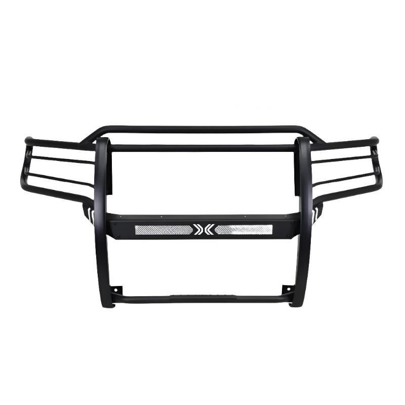 Westins Sportsman X Grille Guard effectively combines aggressive styling with heavy duty front end protection. Engineered to provide both great looks and performance, Sportsman Xs unique design compliments todays larger grille designs, and is available to fit most full and mid size truck applications. Sportsman X has an optional detachable mesh panel (sold separately) which is specifically designed to fit the opening in the center section of Sportsman X Grille Guard, or can be removed to accommodate the flush mounted 26" dual row LED light bar (sold separately). A smaller removable mesh panel designed for the factory sensor location opening is included as standard with Sportsman X. For specific Chevy and Dodge/RAM applications a Sportsman X Sensor Kit (sold separately) is available. An exterior step plate is located on the 1-5/8" bottom tube to provide easy access to the engine compartment. Built with heavy duty 2-1/4" upright rubber strips and 1- 5/8" outer tubes, Sportsman X Grille Guard is designed to provide protection and style for years to come.