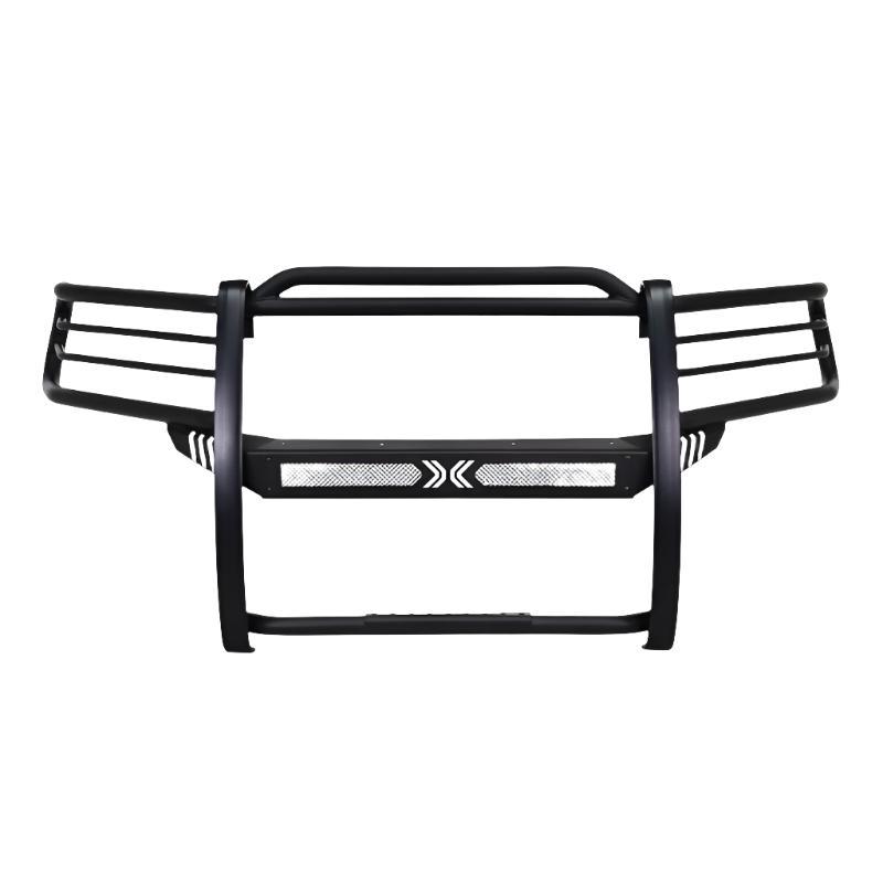 Westins Sportsman X Grille Guard effectively combines aggressive styling with heavy duty front end protection. Engineered to provide both great looks and performance, Sportsman Xs unique design compliments todays larger grille designs, and is available to fit most full and mid size truck applications. Sportsman X has an optional detachable mesh panel (sold separately) which is specifically designed to fit the opening in the center section of Sportsman X Grille Guard, or can be removed to accommodate the flush mounted 26" dual row LED light bar (sold separately). A smaller removable mesh panel designed for the factory sensor location opening is included as standard with Sportsman X. For specific Chevy and Dodge/RAM applications a Sportsman X Sensor Kit (sold separately) is available. An exterior step plate is located on the 1-5/8" bottom tube to provide easy access to the engine compartment. Built with heavy duty 2-1/4" upright rubber strips and 1- 5/8" outer tubes, Sportsman X Grille Guard is designed to provide protection and style for years to come.